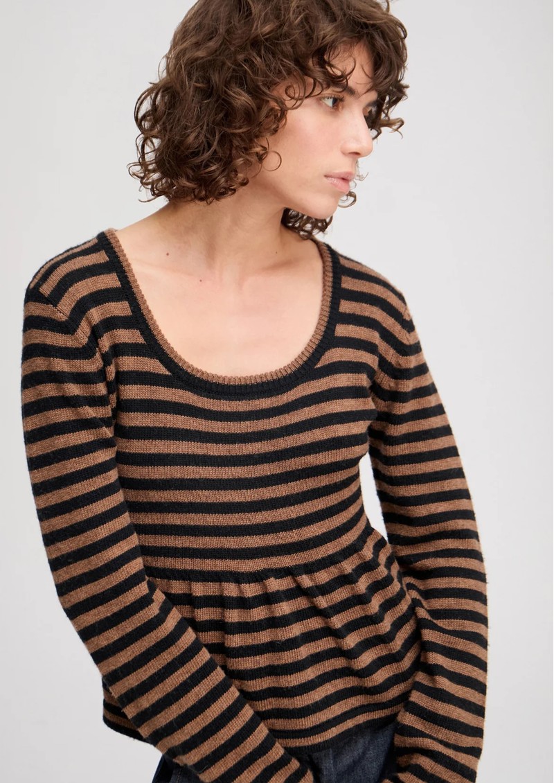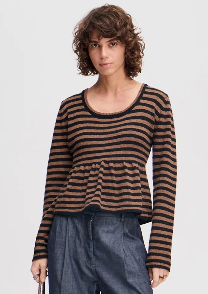 The Munthe Lubay Stripe Jumper features a peplum silhouette for a feminine touch. We love the brown and black colour combination for effortless elegance. Designed with long sleeves, and a deep rounded neckline, it’s perfect for layering across seasons.