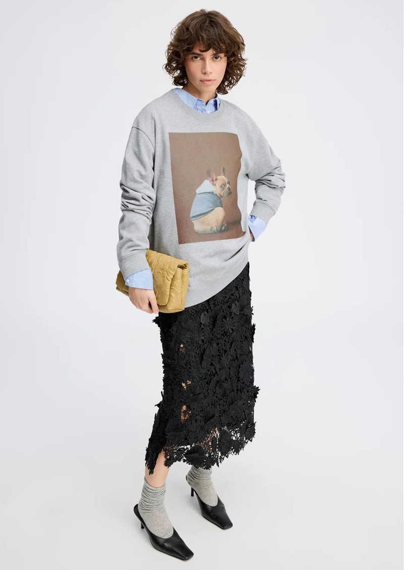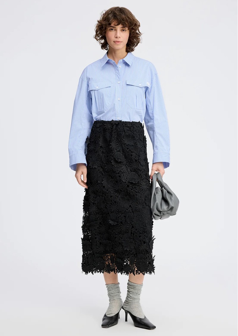 The Munthe Pomi Skirt in Black is an elegant statement piece featuring intricate floral appliqués and sheer lace detailing that adds a touch of romance to its timeless silhouette. Designed with a soft lining, side zipper, and a flowing wide-leg fit, it perfectly balances sophistication and modern femininity.