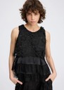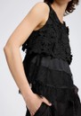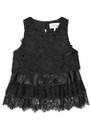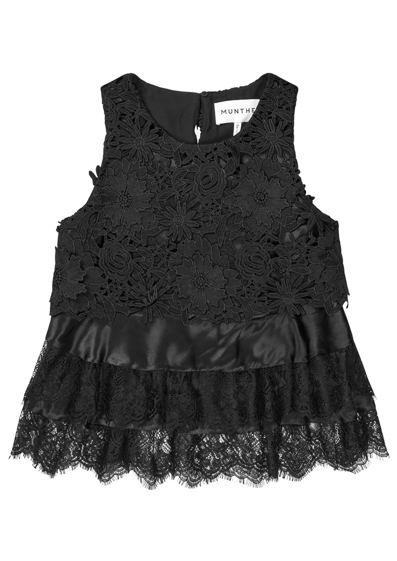 The Munthe Rachine in Black is an elegant lace top adorned with intricate floral embroidery and delicate ruffle trim, featuring a round neckline and a back-neck closure for a refined finish.