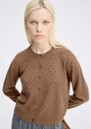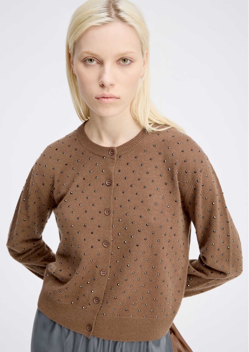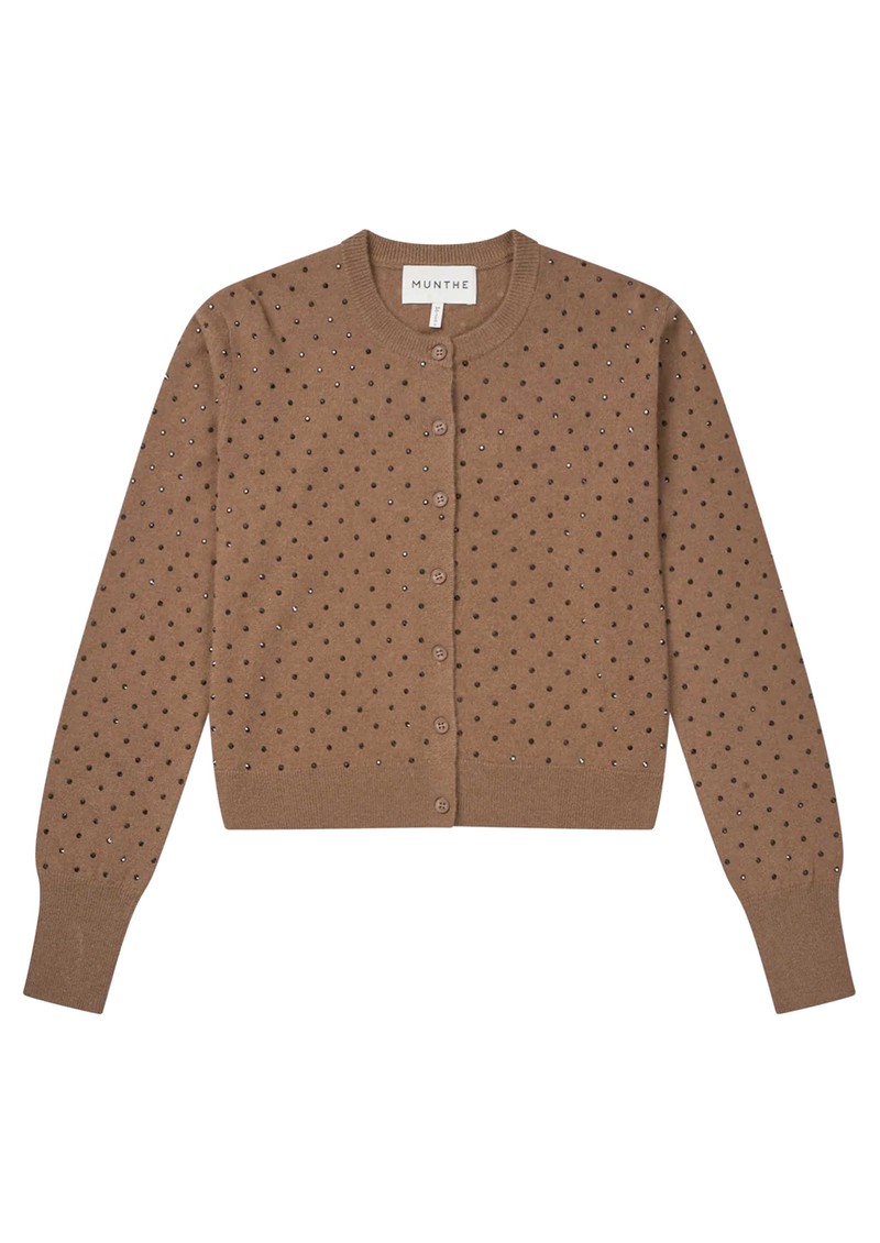 The Munthe Radcliff Cardigan in Brown is a soft, luxurious wool piece featuring elegant silver-coloured studs, a classic round neckline, long sleeves, and a front button closure. Designed with a regular fit, it combines timeless style with refined detailing.