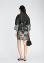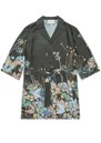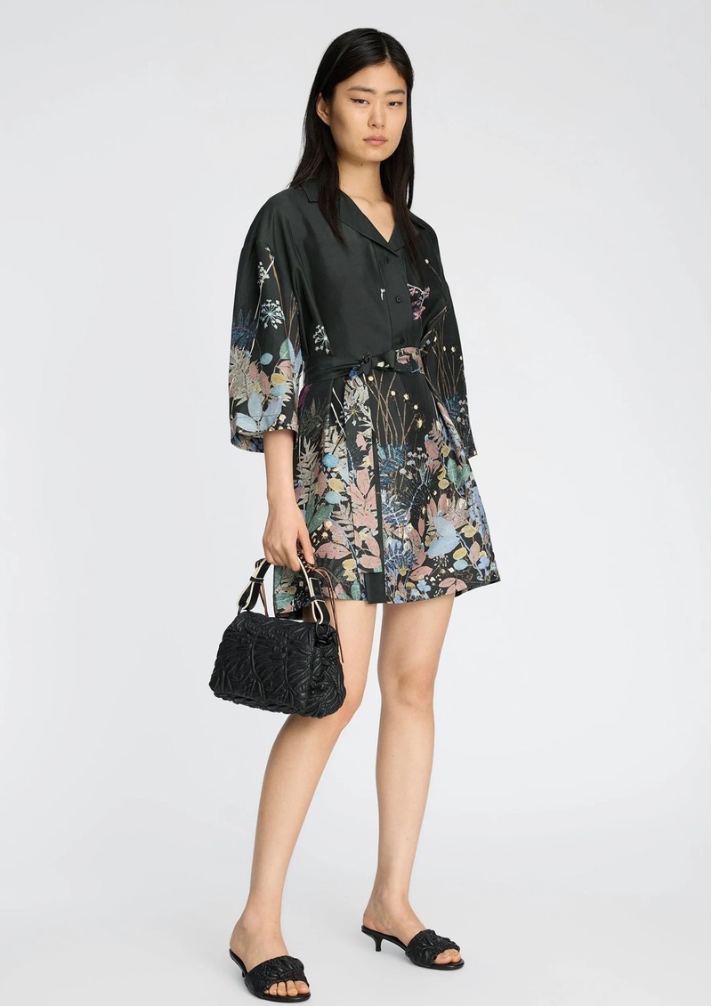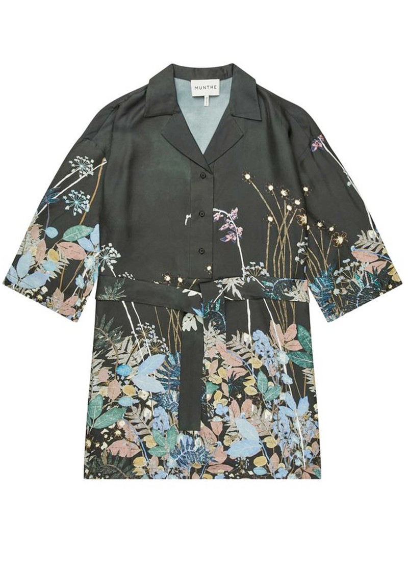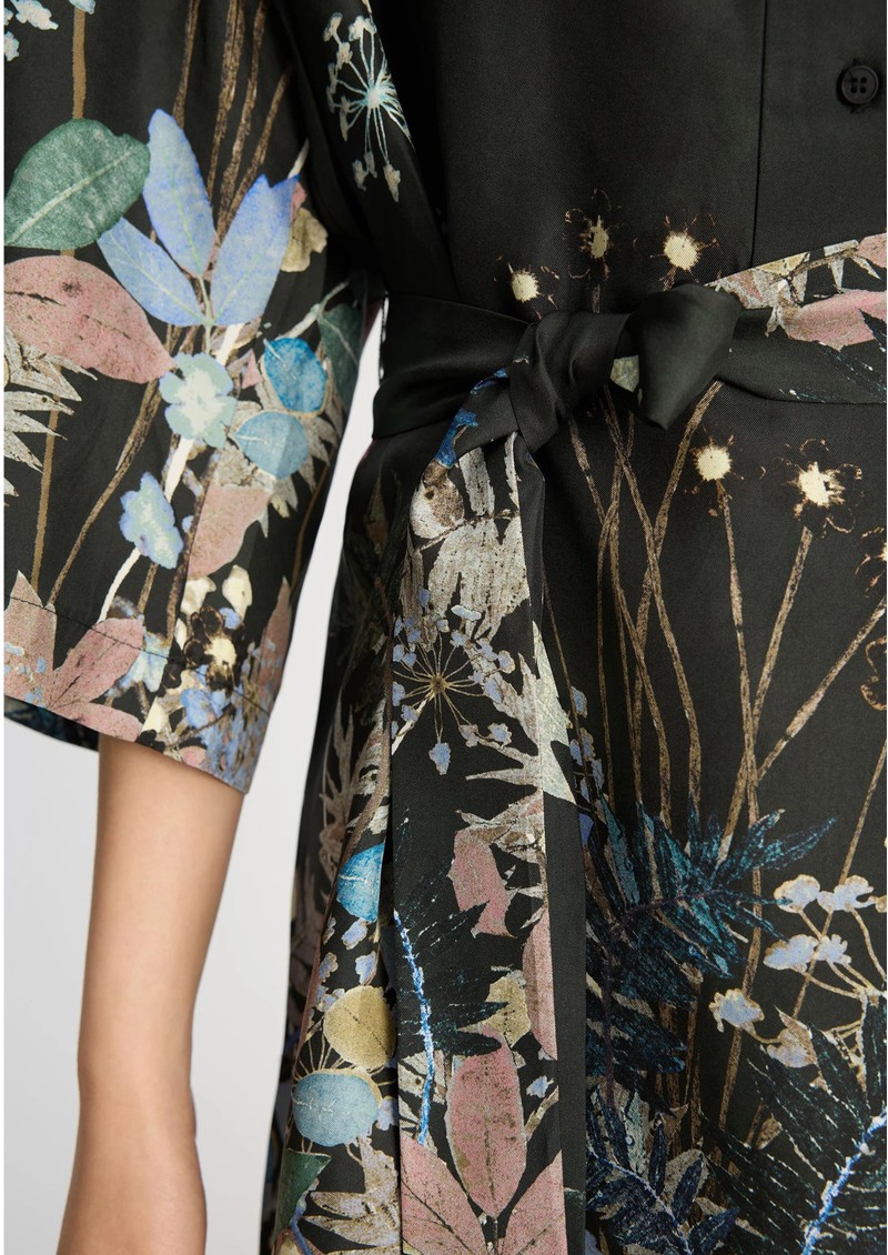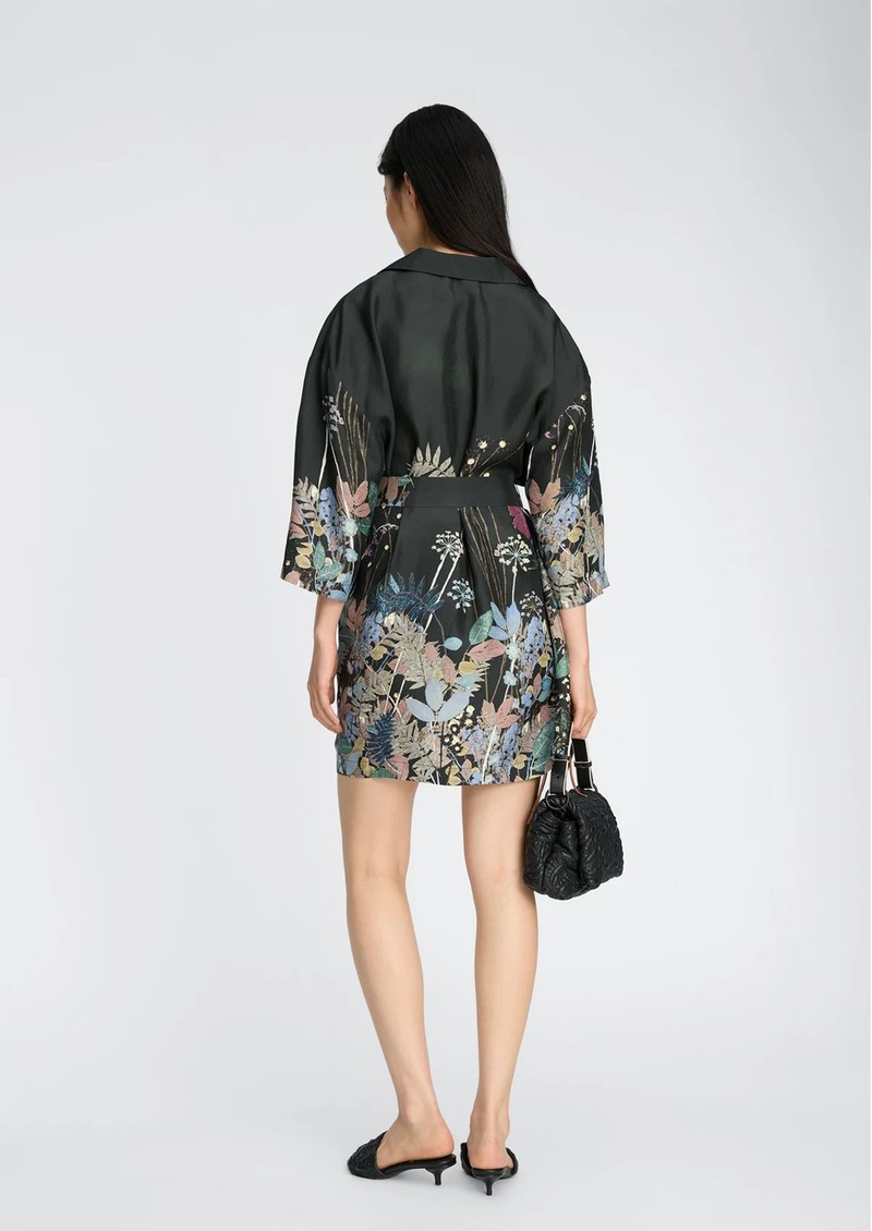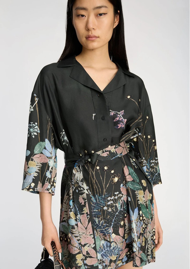 The Munthe Ratana silk shirt features a black base adorned with a contrasting floral print, combining elegance with contemporary design. It has a classic pointed collar, elbow-length kimono-inspired sleeves, a central button closure, and a waist tie for a flattering, cinched effect.