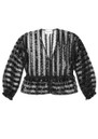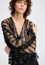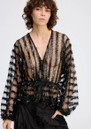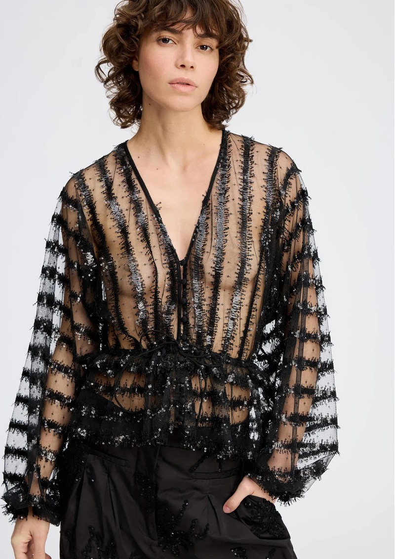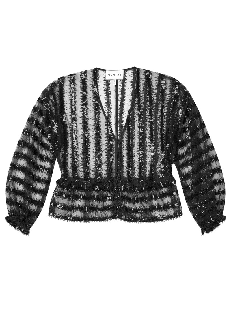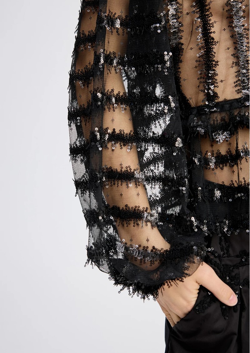 The Munthe Remona in Black is a stunning sheer sequin blouse featuring long, slightly puffed sleeves, a feminine V-neckline, and a waist tie belt that can be fastened into a delicate bow for an elegant finish.