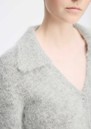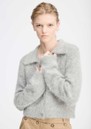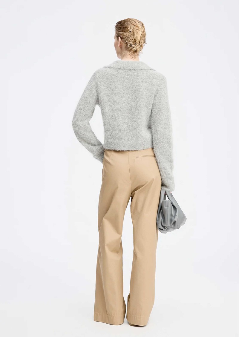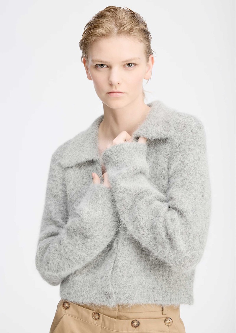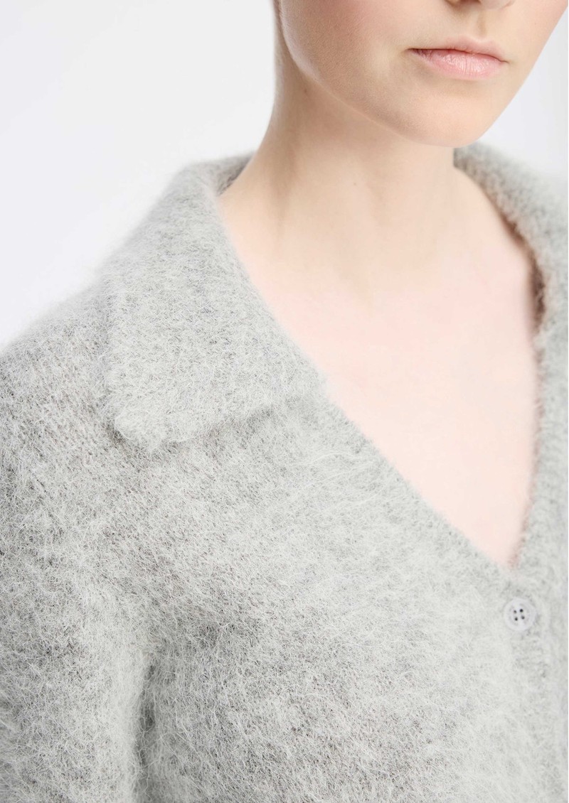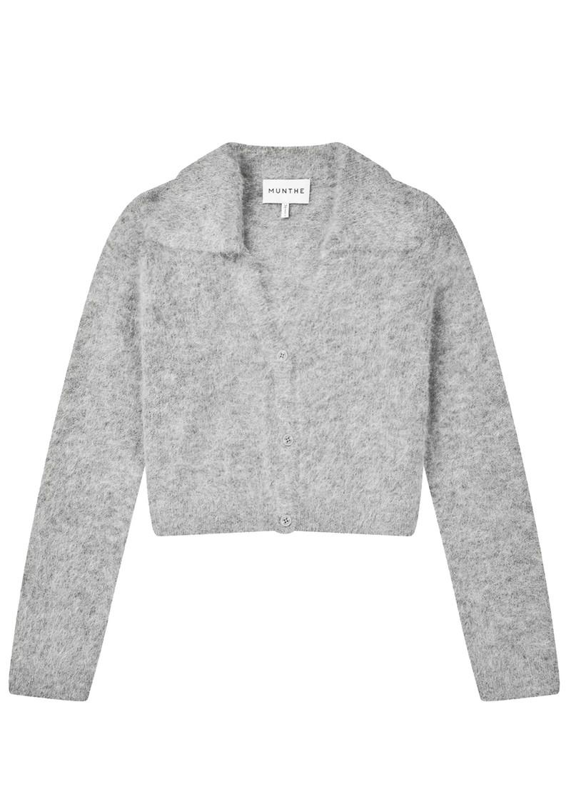 The Munthe Roxas cardigan in grey is crafted from a soft, fluffy alpaca blend, featuring a deep V-neckline, front button closure, and a classic pointed collar. Cropped with ribbed edges at the sleeves and hem, it combines cozy comfort with timeless elegance.