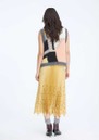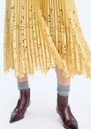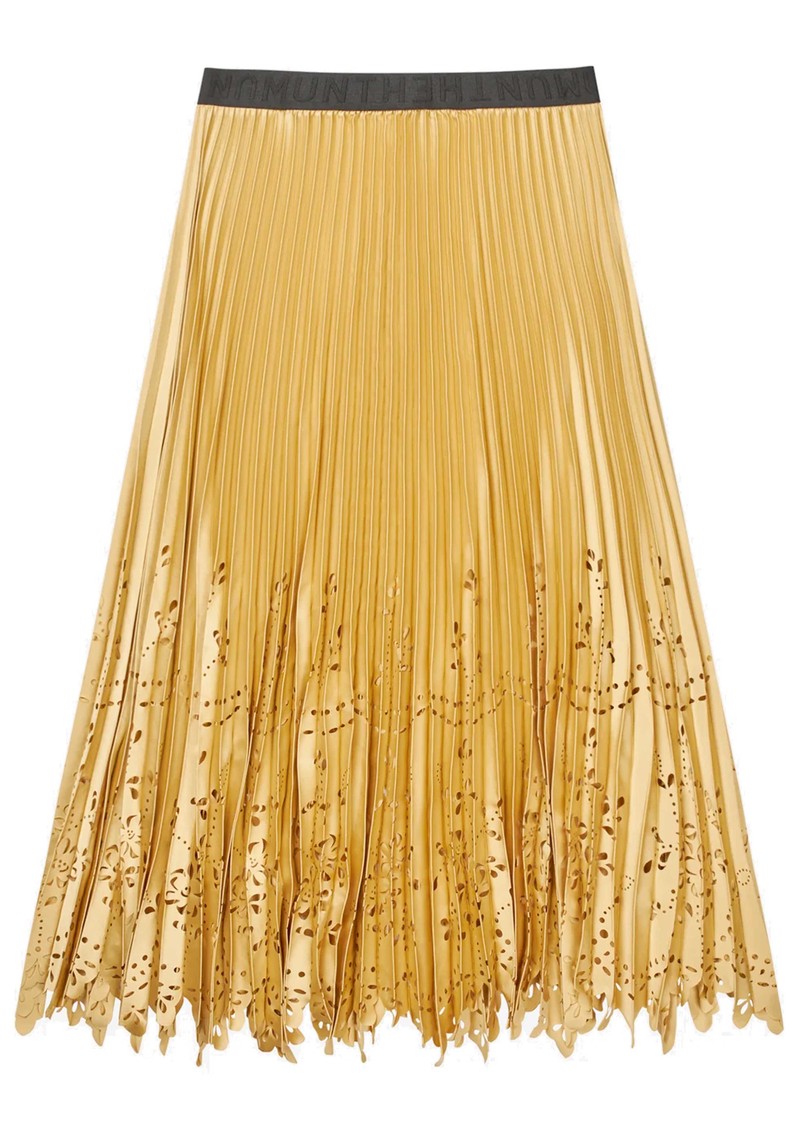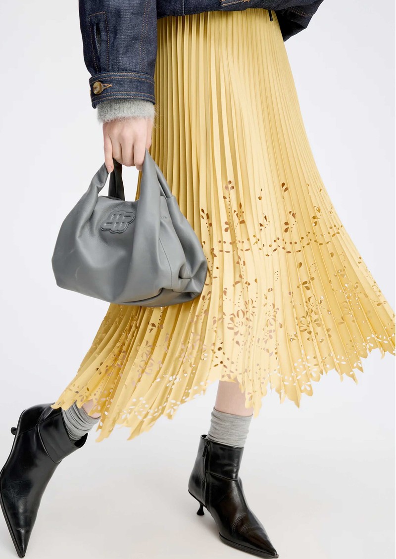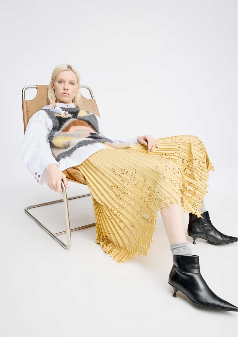 The Munthe Rustali Pleated Skirt in lemon is an elegant midi-length skirt featuring delicate pleats and intricate laser-cut detailing crafted from recycled polyester. Designed with a comfortable elastic waistband accented with a subtle Munthe logo, it combines sophistication with effortless wearability.