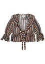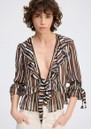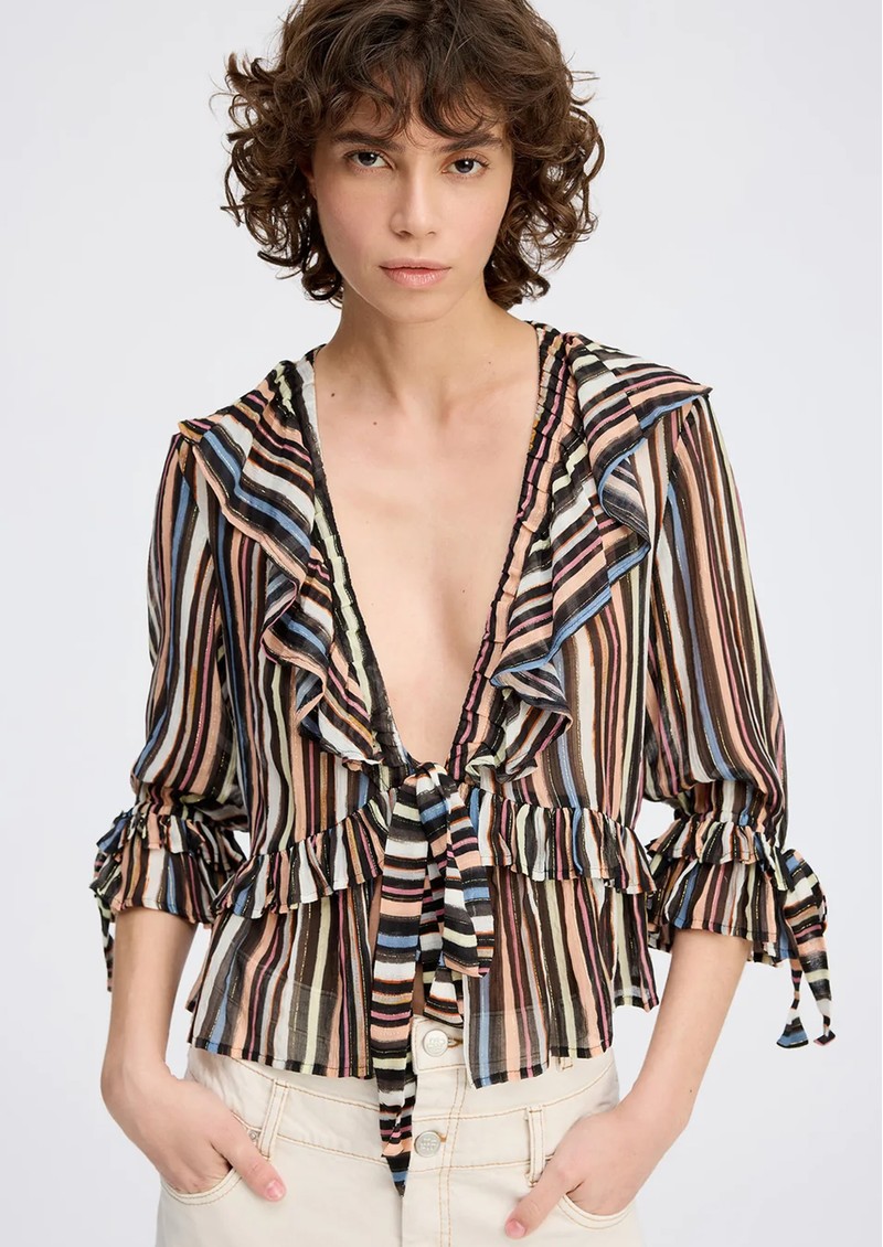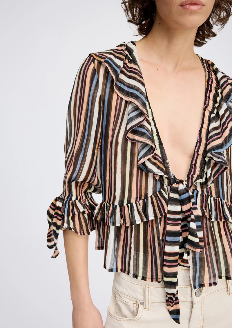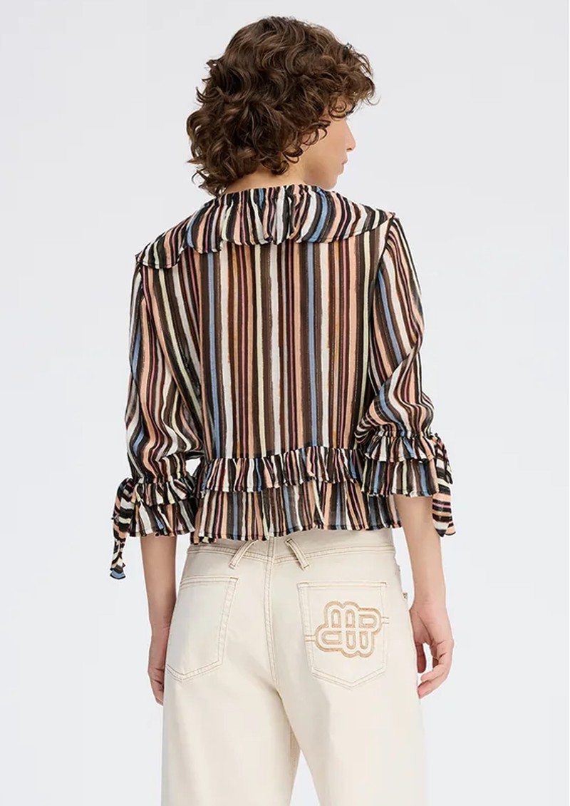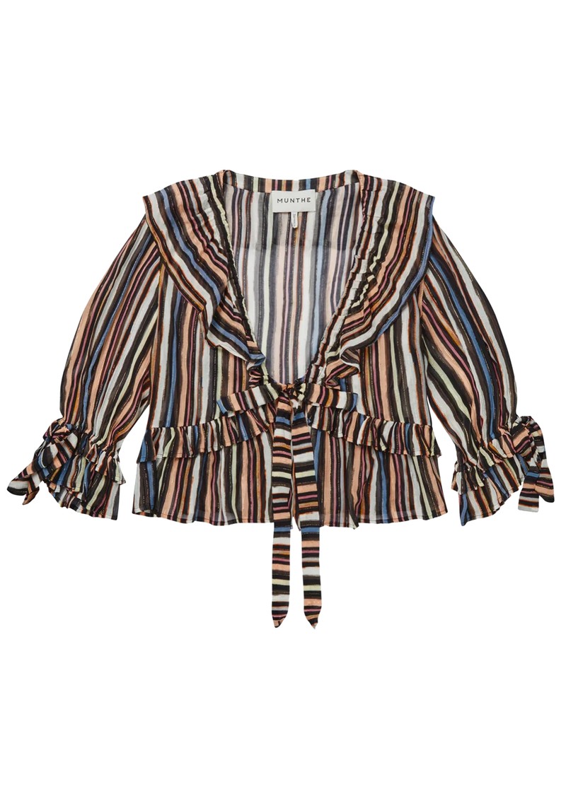 The Munthe Ryley Blouse is an elegant, lightweight piece featuring bold multicoloured stripes with subtle glitter accents, a deep V-neckline, delicate ruffle details, and adjustable ties at the front and sleeves. Crafted from a luxurious viscose-silk blend and produced with minimal-waste printing, each blouse is uniquely patterned for a one-of-a-kind look.