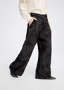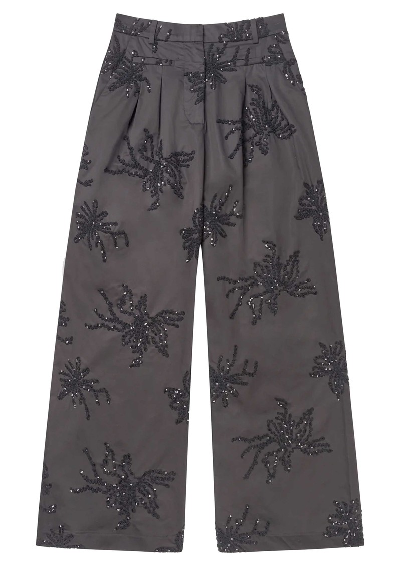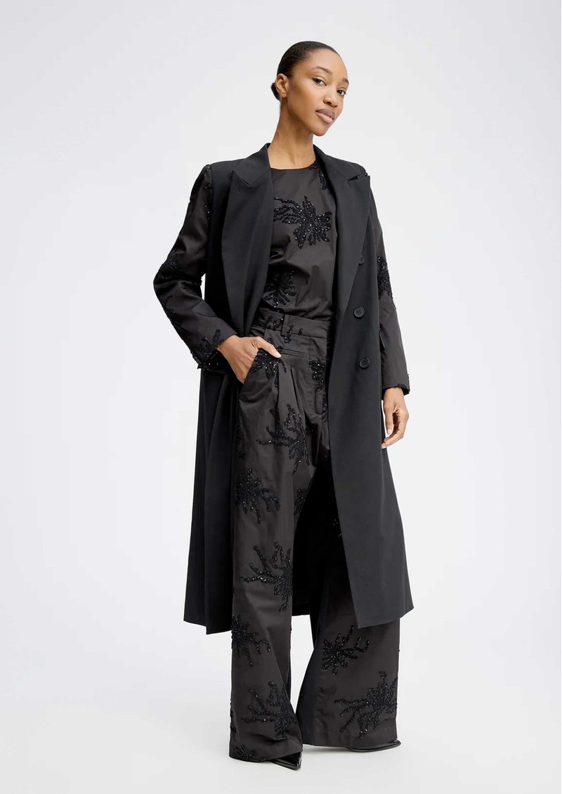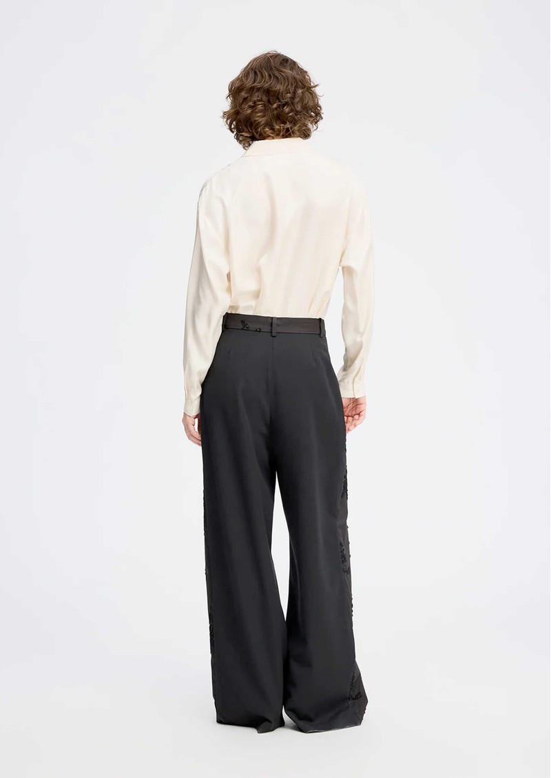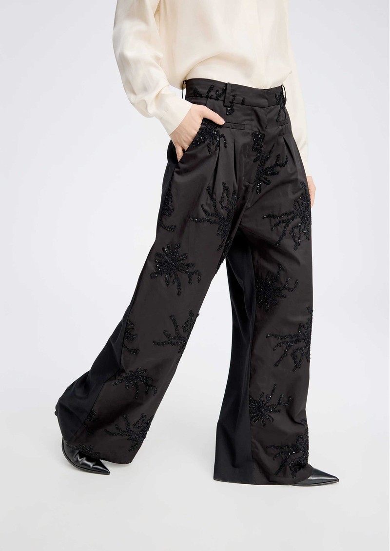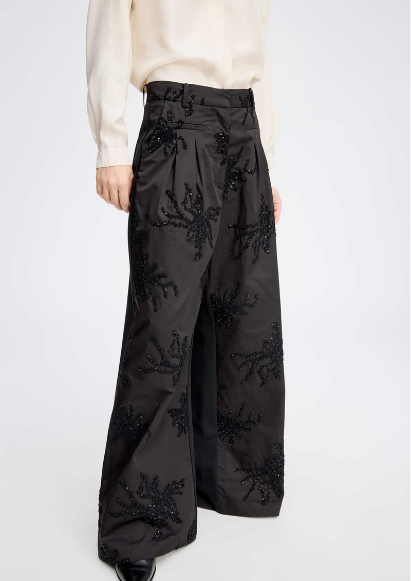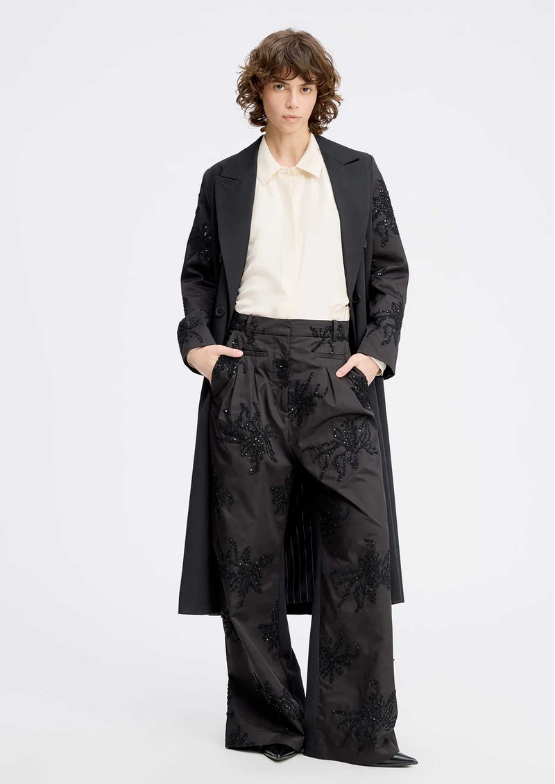The Munthe Stormy Trousers in Black are elegant wide-leg trousers featuring tone-on-tone sequin and bead embroidery, a high waist, pressed creases, belt loops, and side pockets. Made from 100% cotton, they offer a regular fit that combines sophistication with comfort.