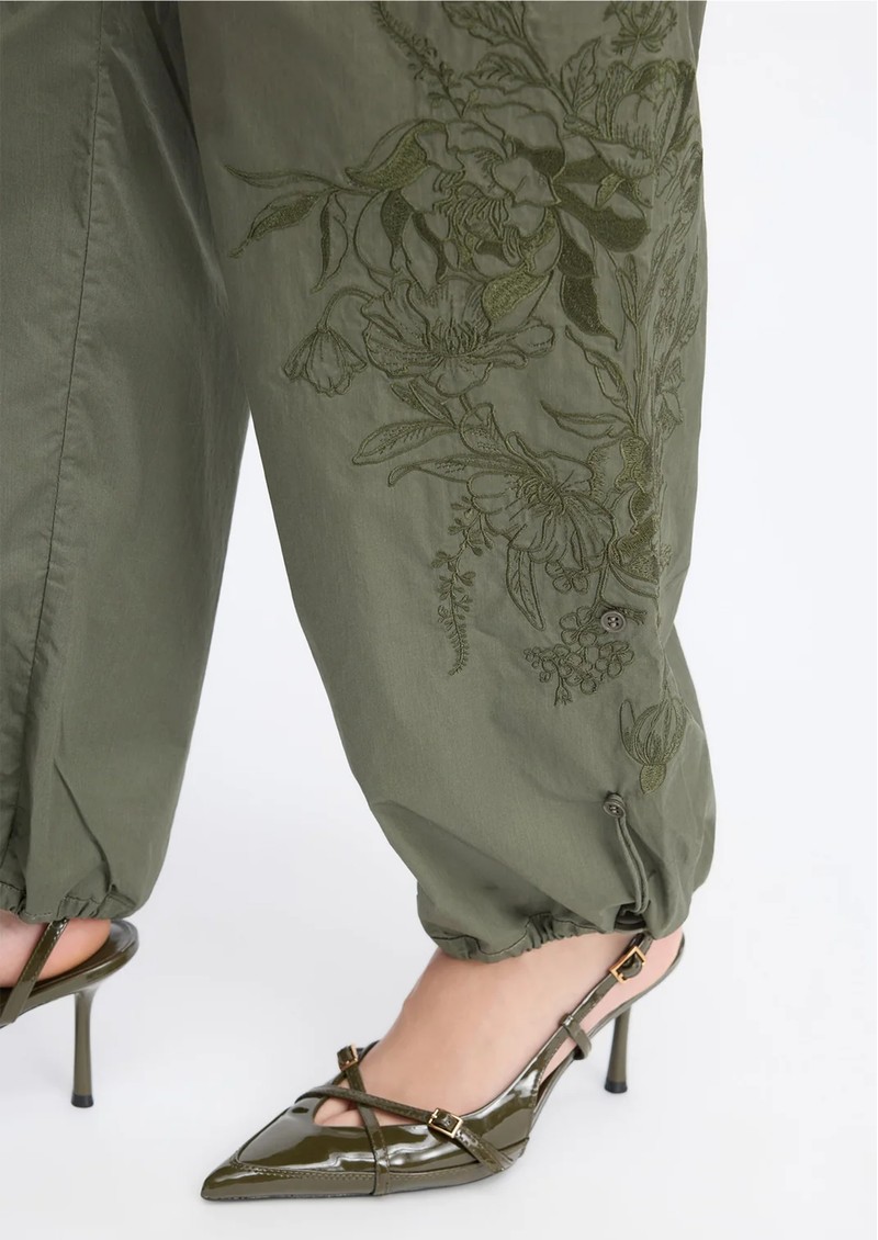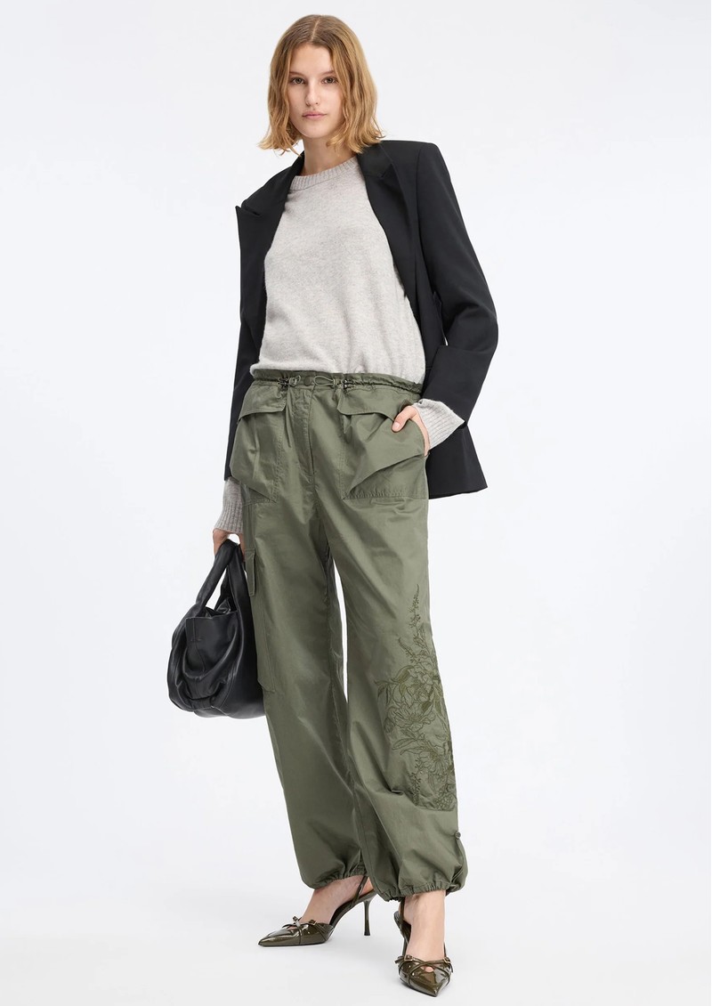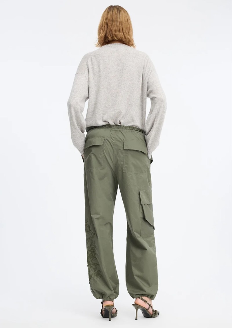 Elevate your casual wardrobe with the Munthe Unform cargo trousers in an army green shade, designed with a relaxed, easygoing silhouette and intricate embroidery along the legs for a stylish twist. Practical flap pockets on the hips, legs, and back, combined with adjustable waist and ankle drawstrings, make these trousers both comfortable and versatile.