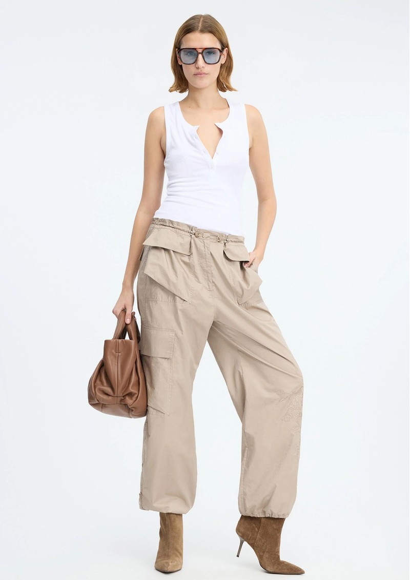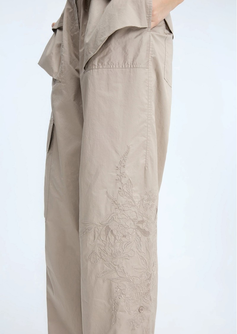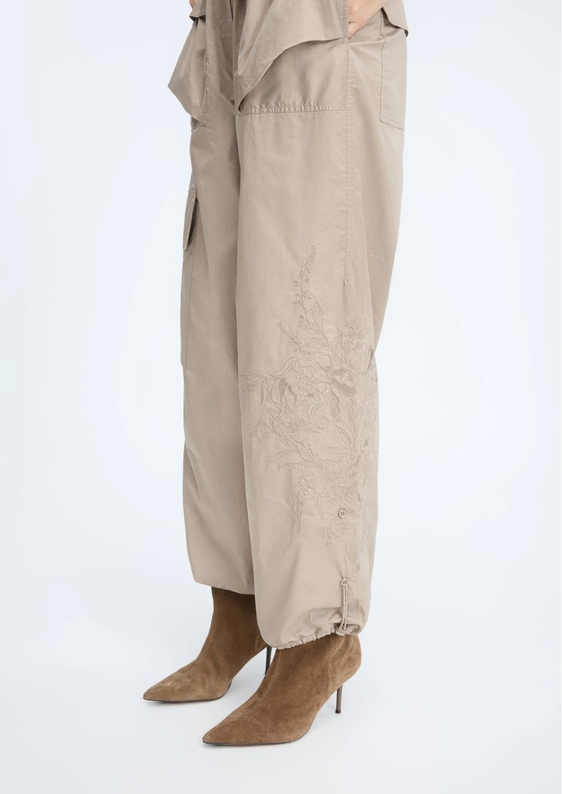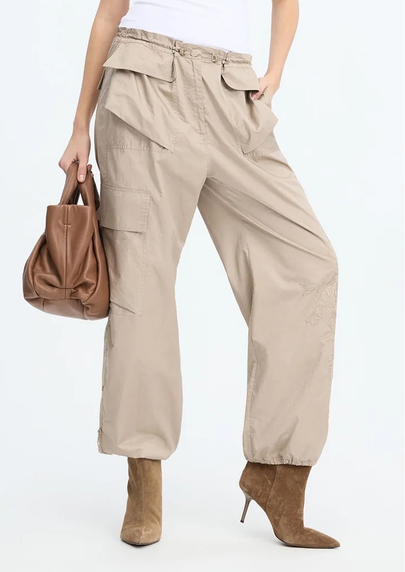 These Munthe Unform cargo trousers offer a relaxed, loose fit with stunning embroidery along the legs, making them a stylish yet functional choice. Featuring flap pockets on the legs, hips, and back, along with adjustable waist and ankle drawstrings, they combine comfort and elegance effortlessly. Key Features include: