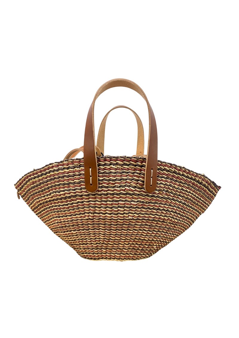 The Muun Mini Sophie Hstripe Straw Bag in Brown/Tan is a versatile hand and shoulder bag, featuring a cotton pouch and a durable straw base hand-woven from resistant elephant grass in Ghana over 2–3 days. Finished and assembled in France, each bag is unique, with natural variations in size, shape, and colour, and the inner pouch is sewn by skilled artisans with disabilities through ISTA.