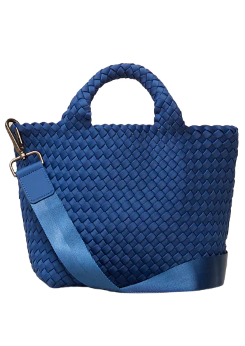 The Naghedi St. Barths Small Tote is crafted from eco-friendly handwoven neoprene, showcasing expert craftsmanship by skilled artisans. Its lightweight, versatile design makes it perfect for everyday use, featuring handles that stretch for a tailored fit and a detachable, adjustable crossbody strap for added flexibility. Key features include: