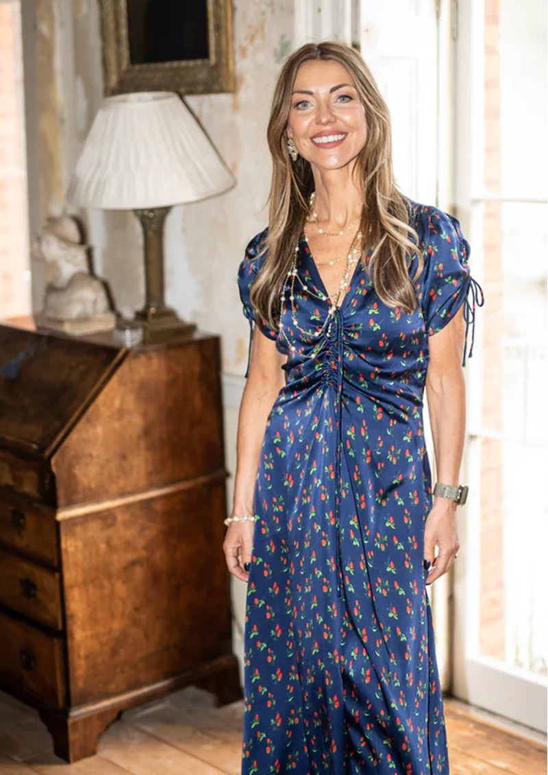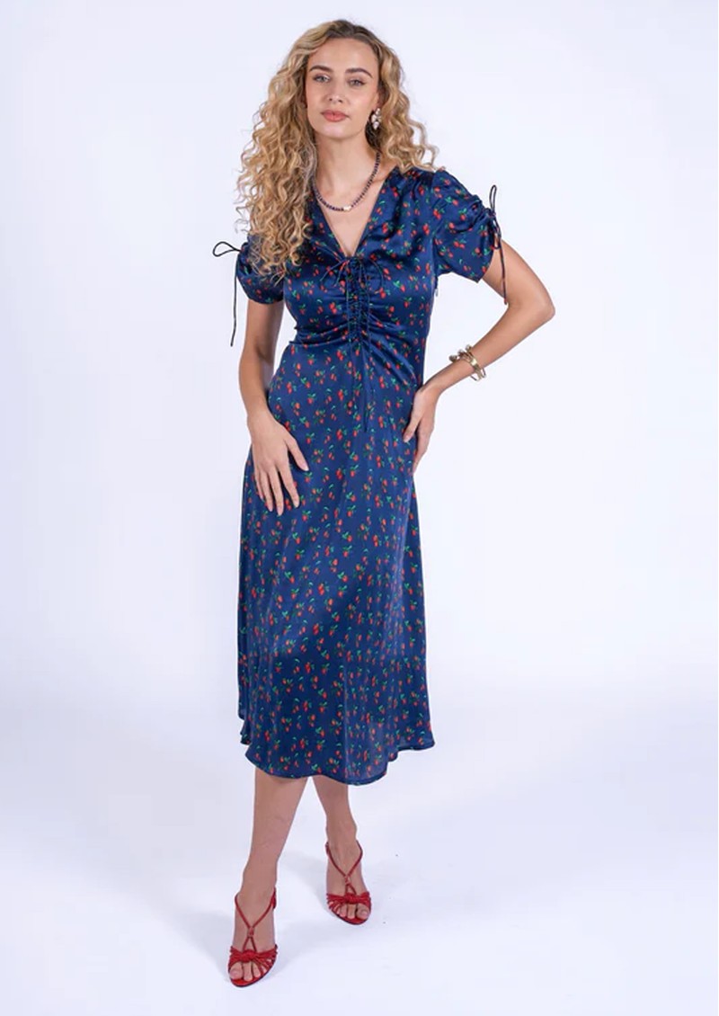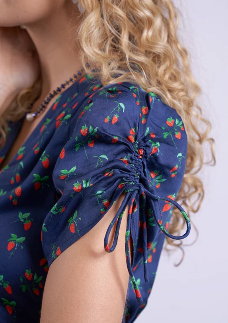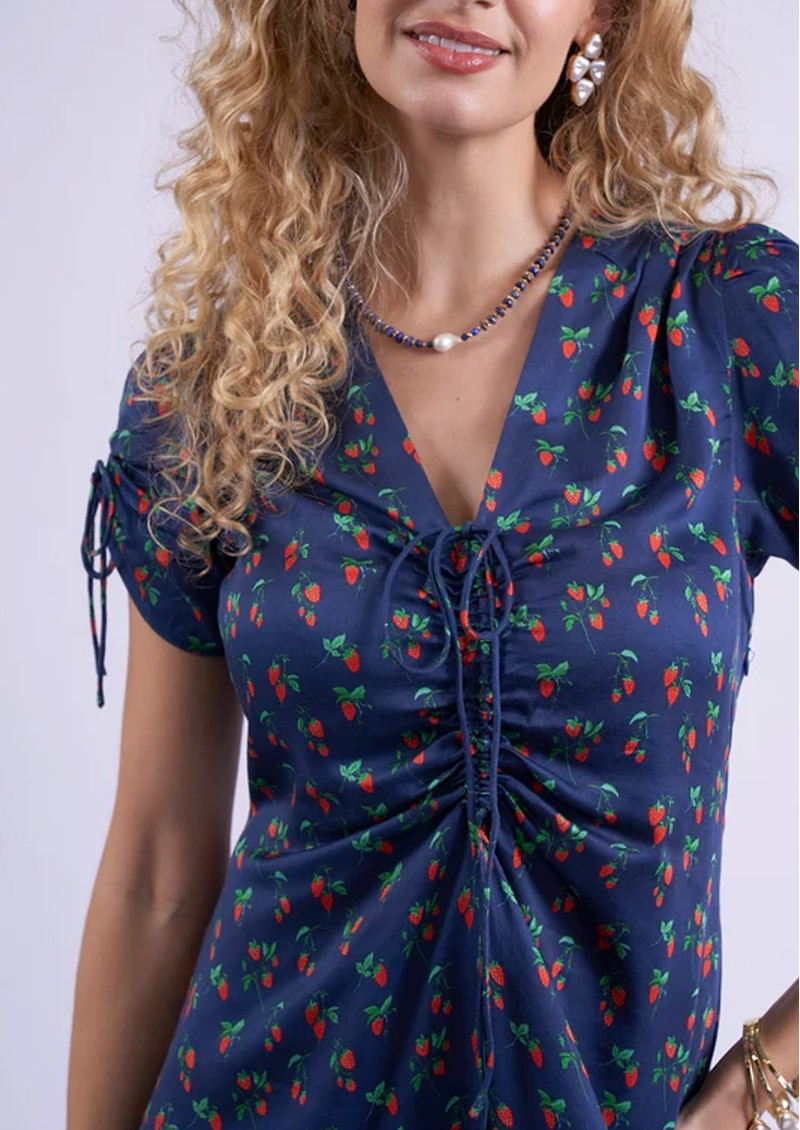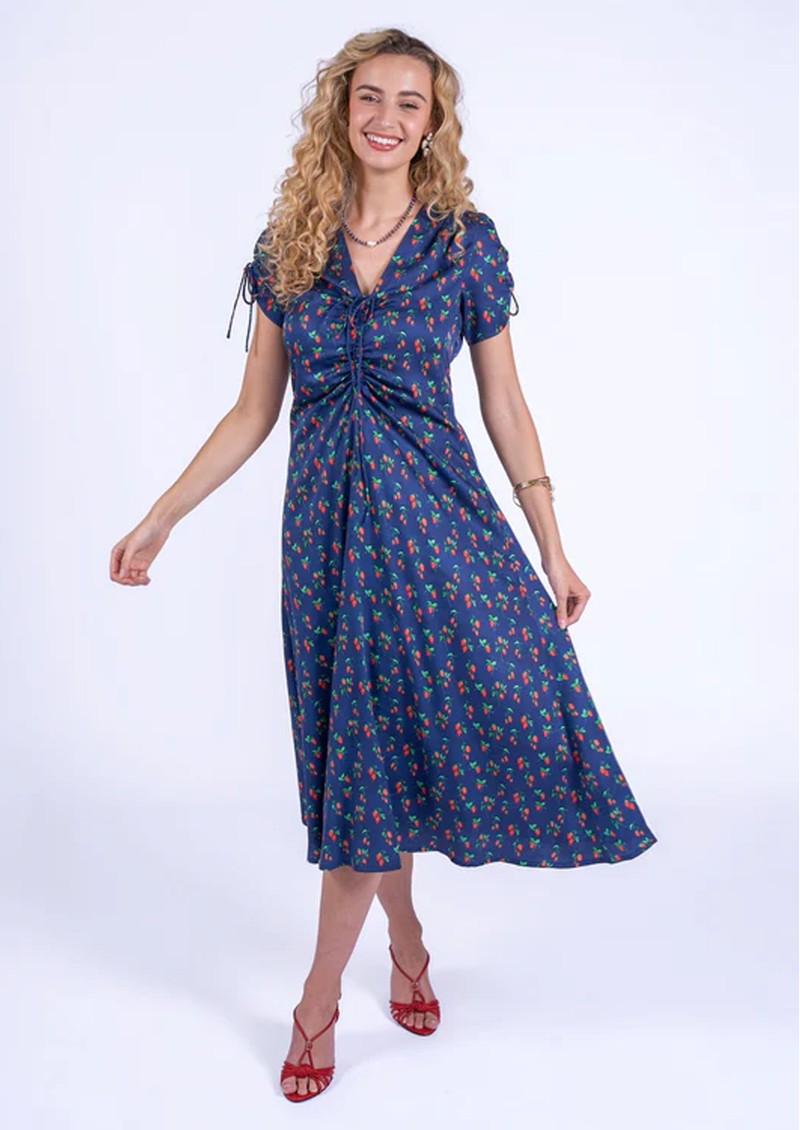 Introducing the Babington Dress from New Day Originals. Made from a fluid viscose fabrication, this midi dress is decorated in a strawberry print, against a navy backdrop. Featuring a ruched bodice and sleeves and elasticated waist, this combines style and comfort. Other features include: