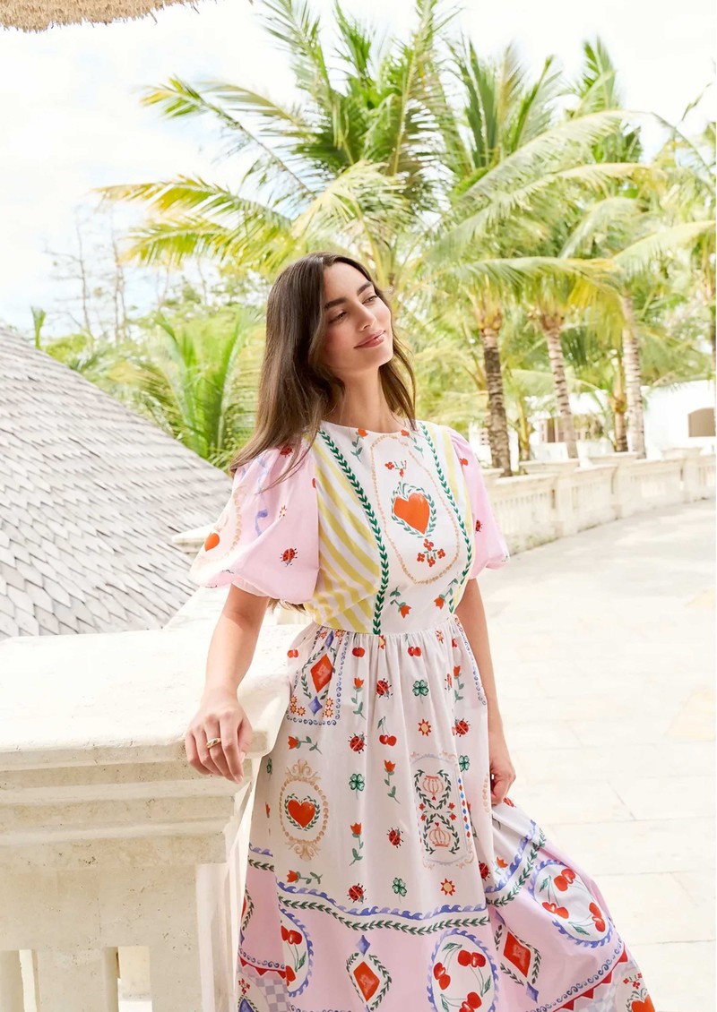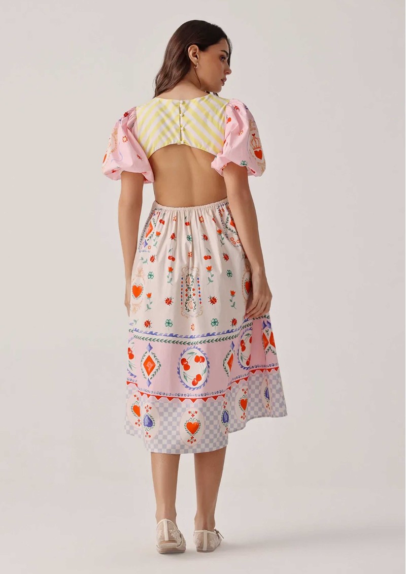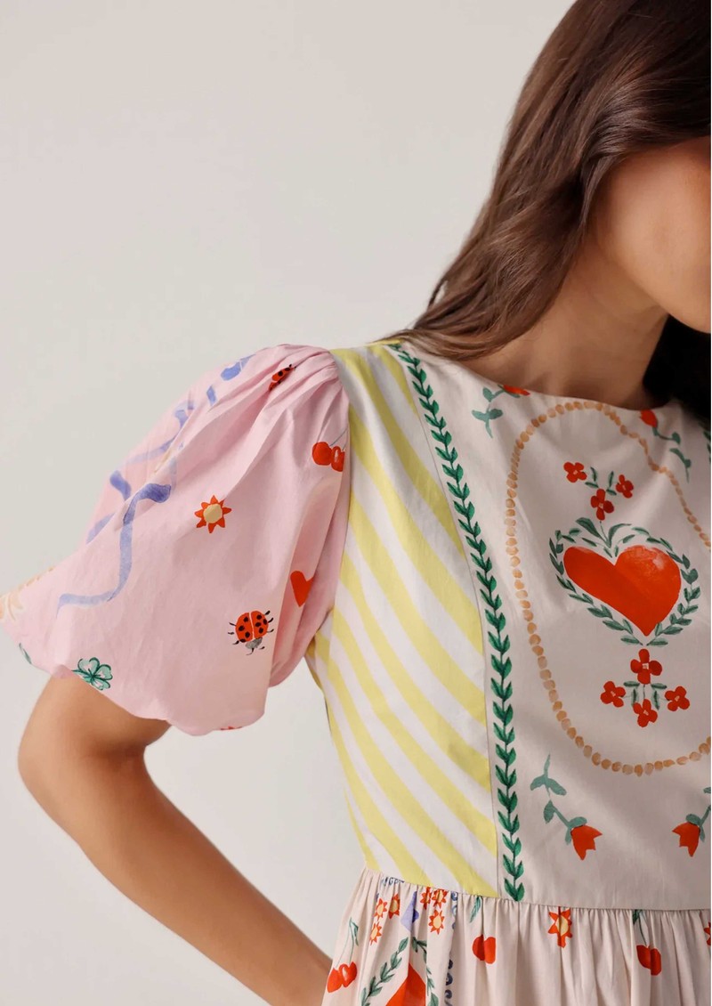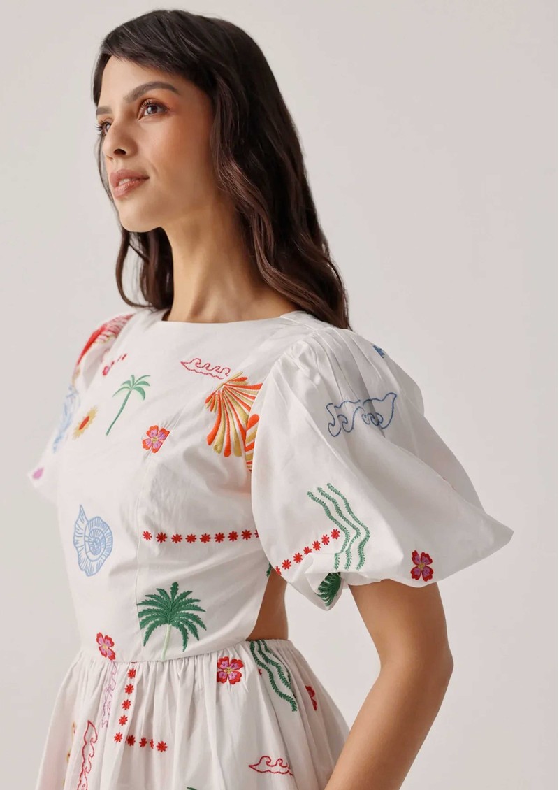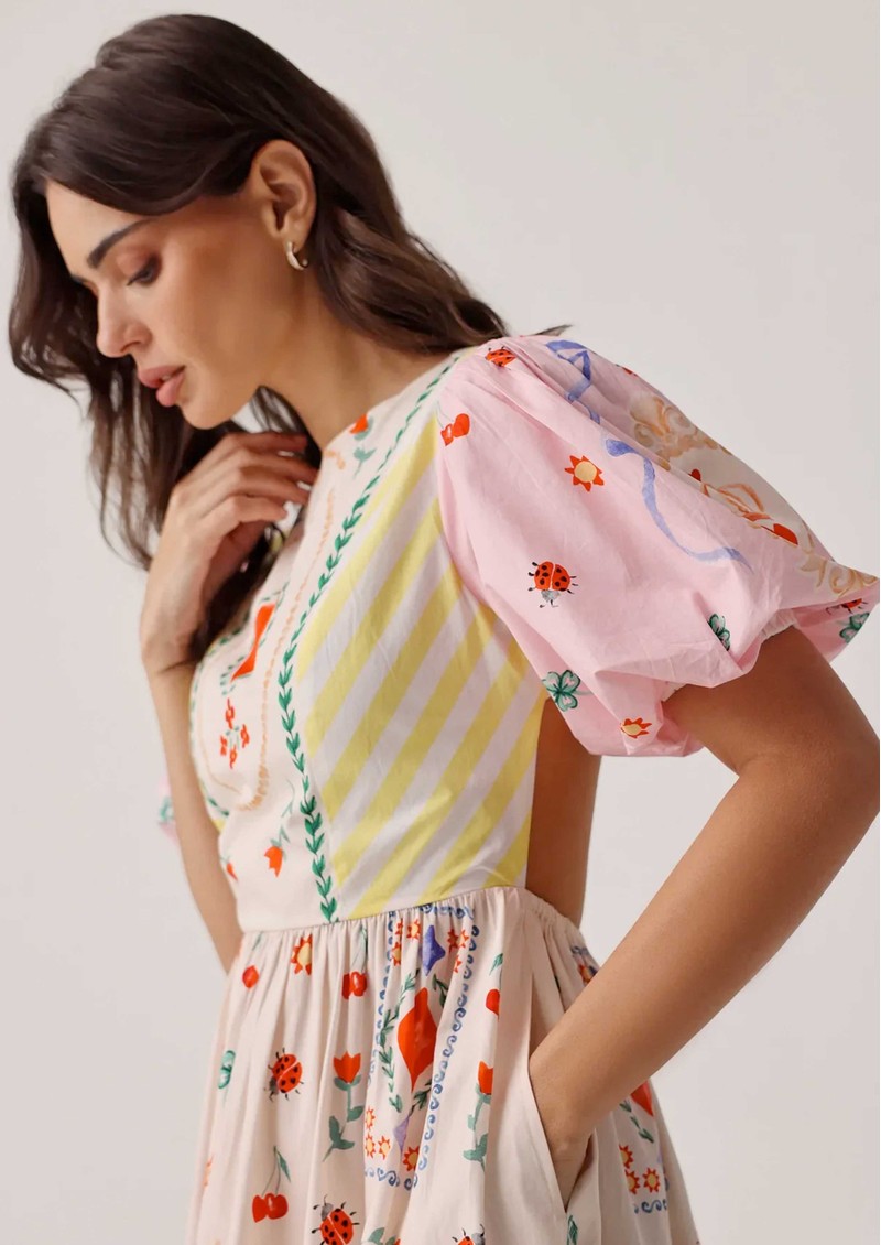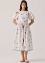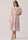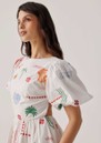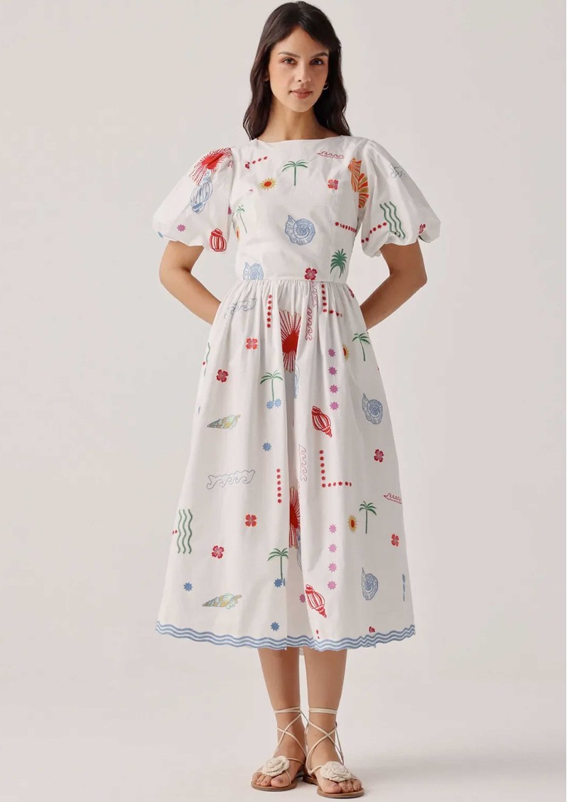 The Noib Lyla midi dress in ecru offers a softly sculpted shape with puffed sleeves and a fluid, easy drape that gives it an understated sense of movement. Cut from crisp Giza poplin and elevated with refined placement print detailing, it features button fastenings, a discreet back cut-out and an elasticated waist panel to ensure a comfortable, flexible fit, making it an effortless piece to wear across the seasons.