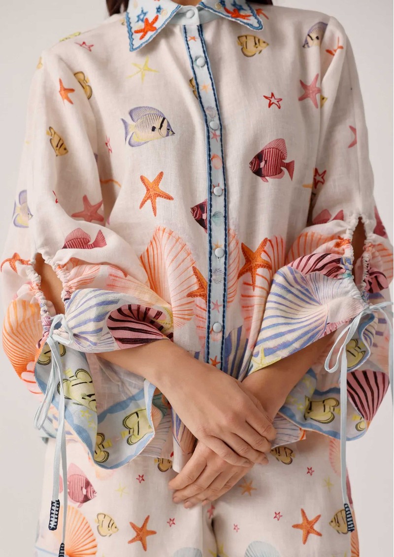 The Noib Thais linen shirt features an oversized, relaxed silhouette designed for an easy, laid-back drape. Crafted in a breathable linen-lyocell blend with placement print detailing, it’s finished with subtle embroidered accents at the collar and adjustable sleeve drawstrings that create a softly ruched effect for added texture and shape.