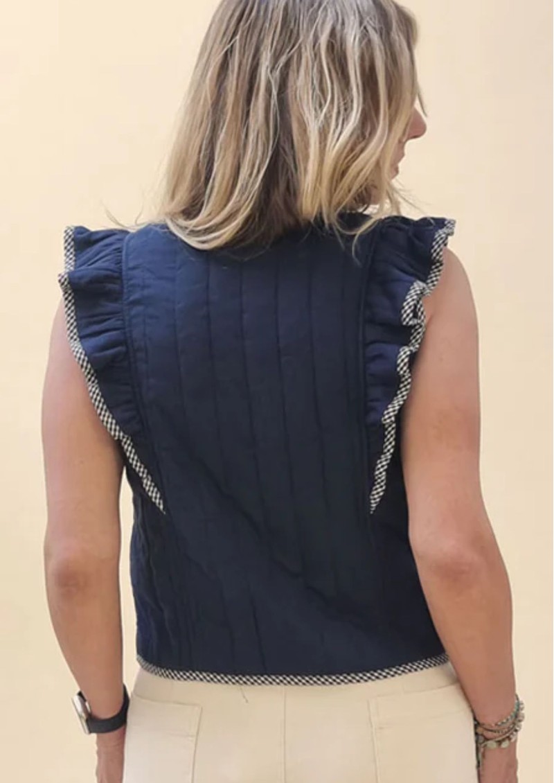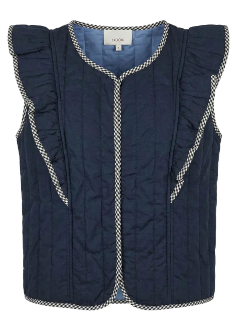 Say hello to the Nooki Aster Padded Gilet. This fun piece is excellent for layering. This piece features ruffle detailing at the sleeves, and check contrast piping. Layer over anything from a shirt, to a dress for endless styling oppertunities. Key features of this Nooki gilet are: