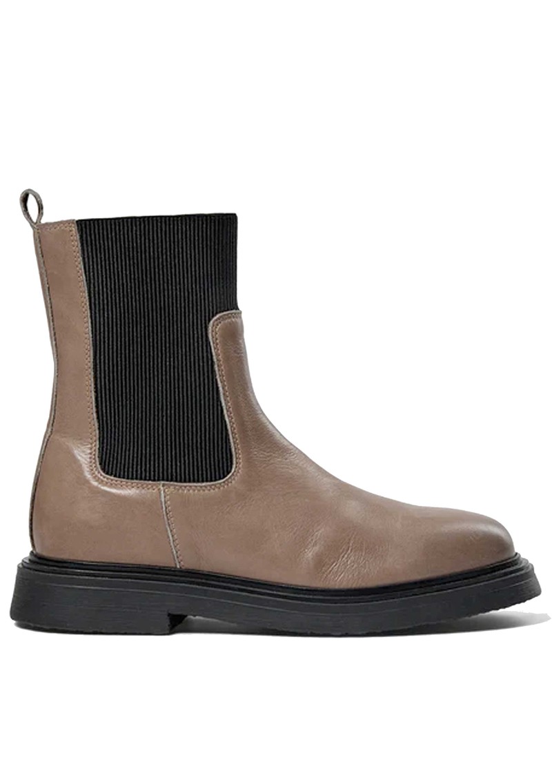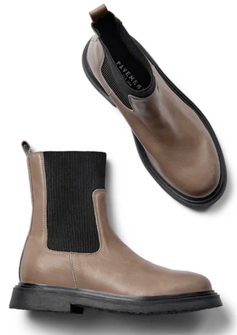 The Pavement Friia Leather Ankle Boots in Taupe are elegant pull-on riding-style boots, crafted in Portugal with stretch panels and a rear ankle tab for effortless style and comfort.