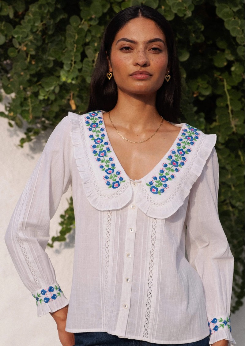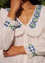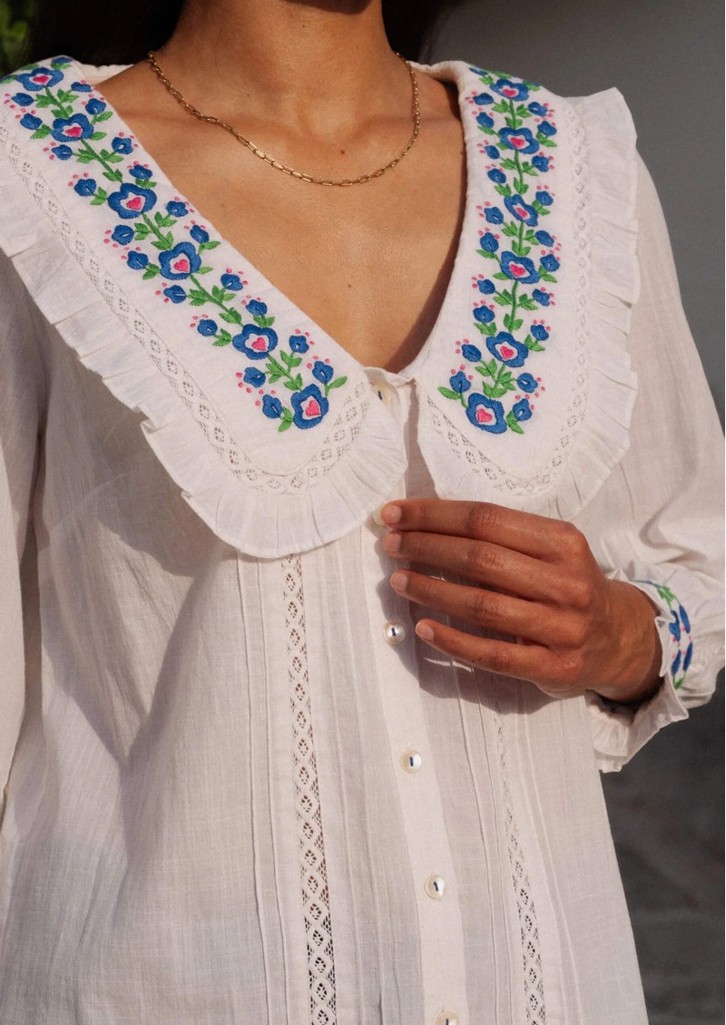 - Hand-embroidered floral motifs at the collar and cuffs