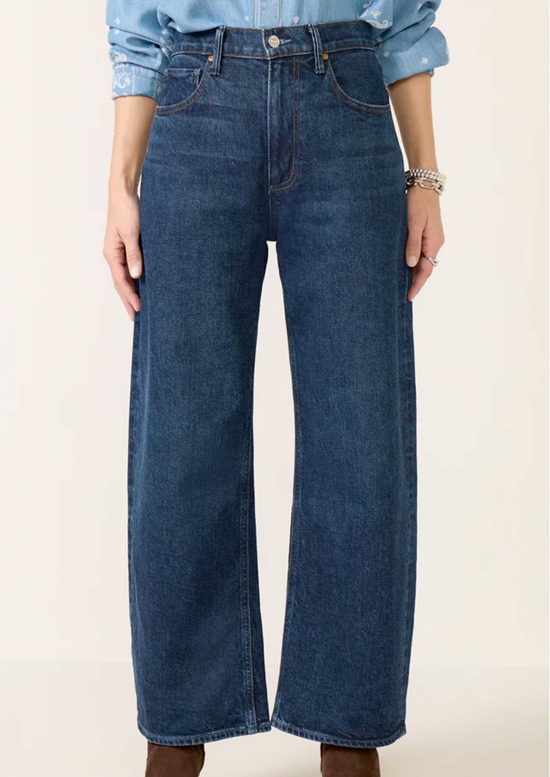 The Paige Denim Arellia Skimmer barrel jean by Paige Denim brings a fresh, sculpted shape to your denim line-up, cut in a rich blue wash with a flattering high-rise waist and softly curved wide barrel leg. Made from a supple cotton blend with a touch of stretch, this full-length style evokes an effortlessly modern finish that feels as good as it looks.
