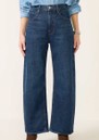 - Barrel leg with a curved, wide silhouette