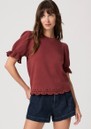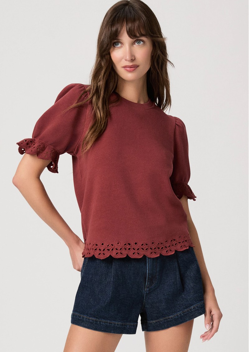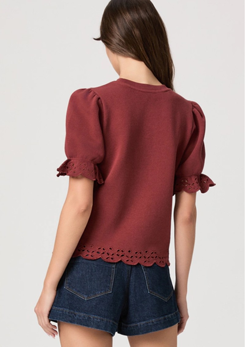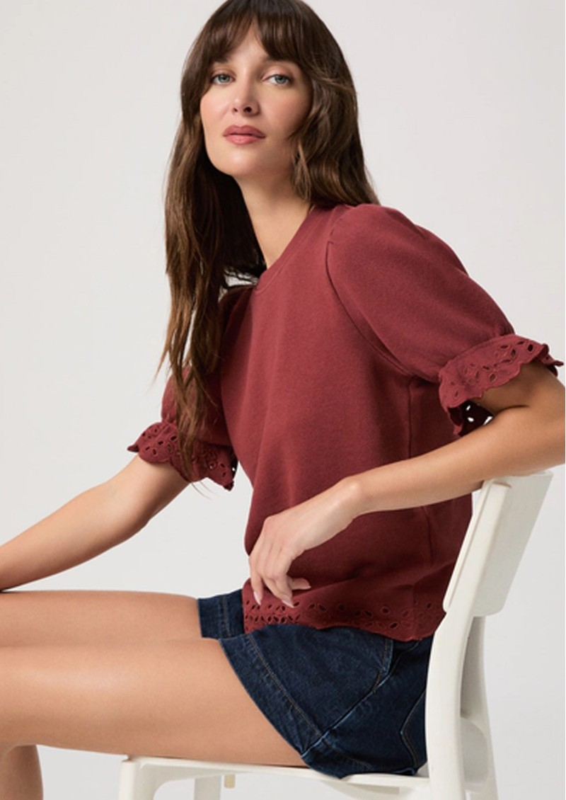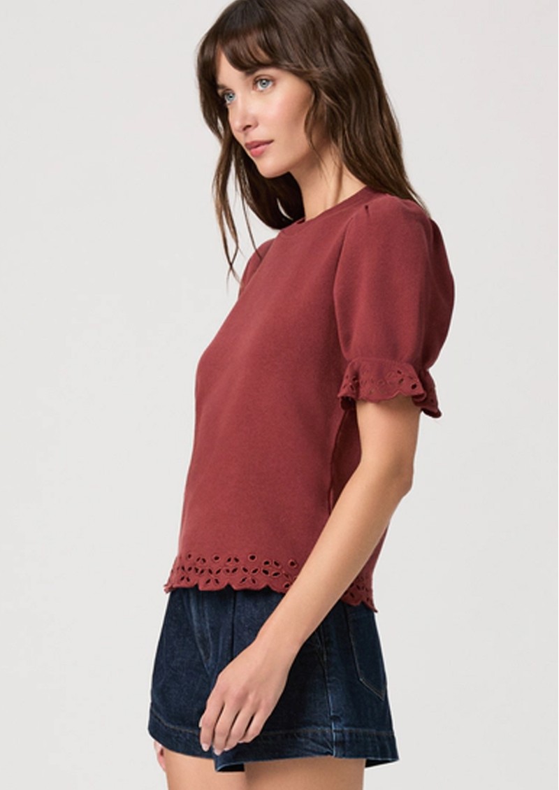 Introducing the Paige Denim Ciabatta Top which is crafted in a light, and super soft cotton. Designed in a warm burnt sienna hue, this top features a short puff sleeve with scalloped embroidery around the edges. Other features include: