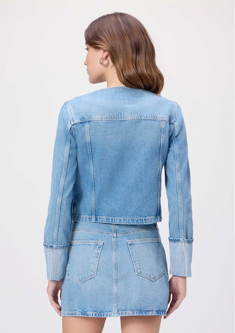 The Dean Jacket in del amo by Paige is a modern, collarless denim trucker designed with wide cuffs and a sleek silhouette. Crafted from rigid denim with a soft hand-feel, it features double chest pockets, silver buttons, and subtle seaming details for a polished, everyday look.