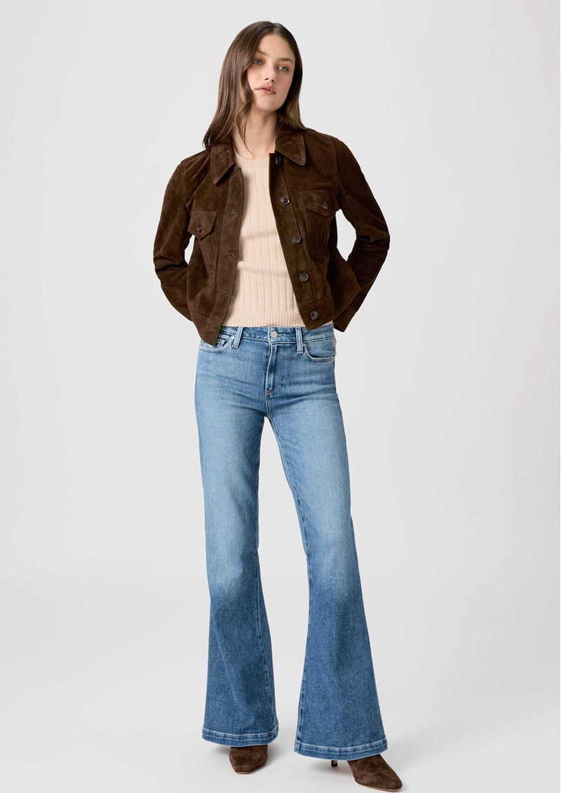 The Paige Denim Genevieve 32” Flare Jean offers a vintage-inspired, high-rise silhouette designed to elongate the legs with a flattering, lean look. Crafted from Transcend Vintage denim in a medium blue wash with natural fading, it combines the signature comfort of Paige’s stretch denim with the character of well-loved jeans.