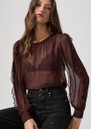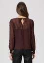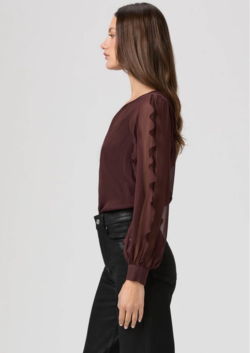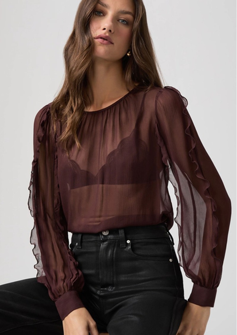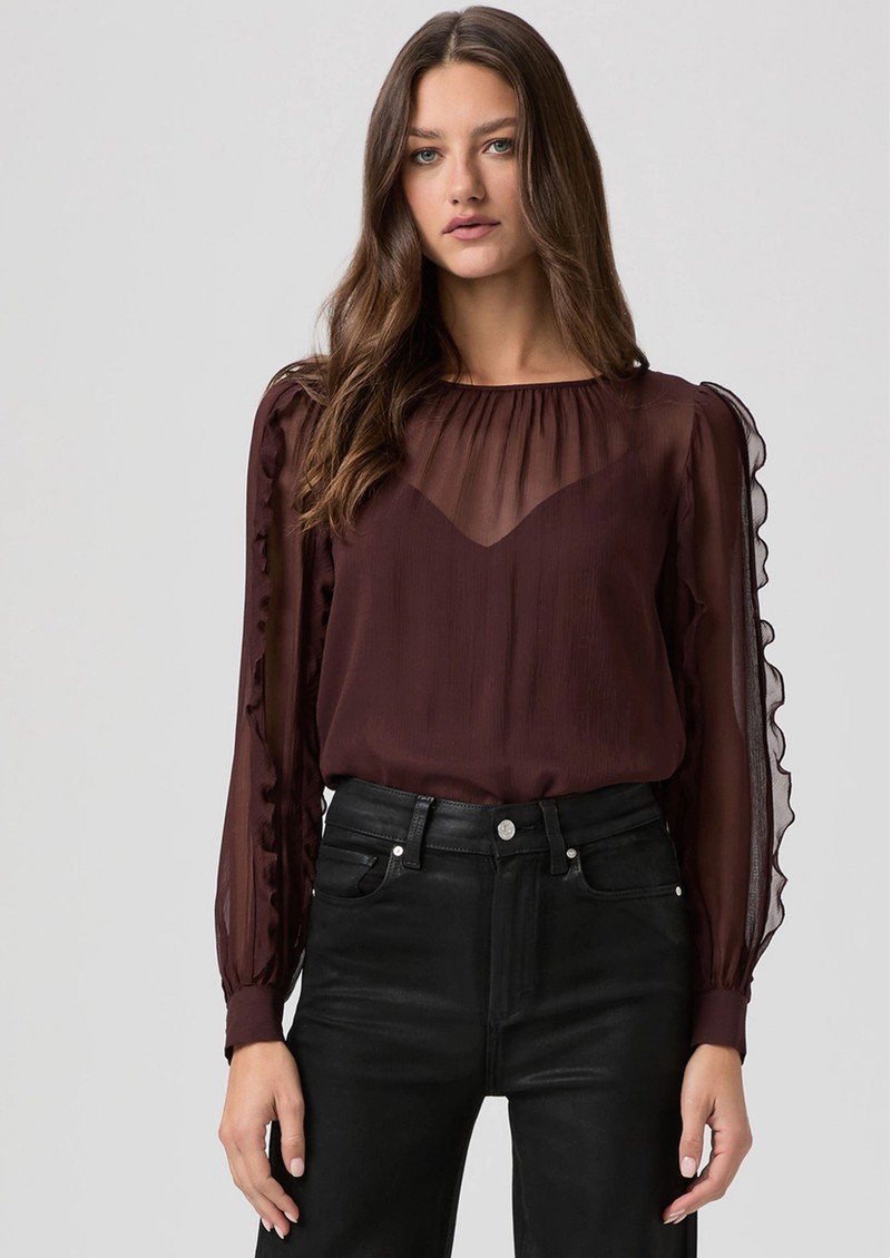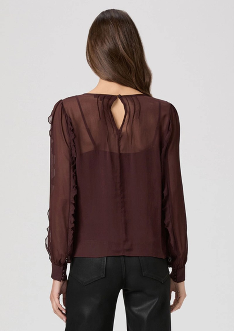 The Paige Isabel Blouse in Aubergine is an elegant, romantic top crafted from 100% silk crinkle georgette. The relaxed-fit, long-sleeve blouse features a crew neckline with delicate shirring, cascading ruffles on the sleeves, pleated back detailing, a subtle keyhole at the neck, wide cuffs, and a detachable V-neck cami for versatile styling and coverage.