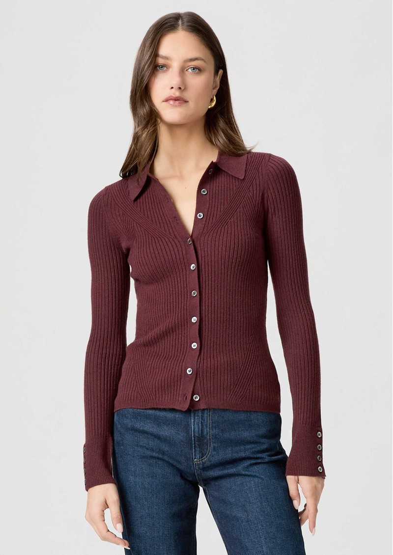 The Paige Jayde ribbed polo in oxblood is a sleek, long-sleeved knit crafted from a soft, compact yarn that delivers a polished yet comfortable feel. Its rich red hue, ribbed texture and subtle sleeve buttons make it an easy match with denim in any shade.