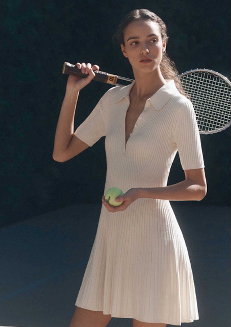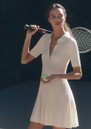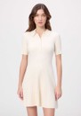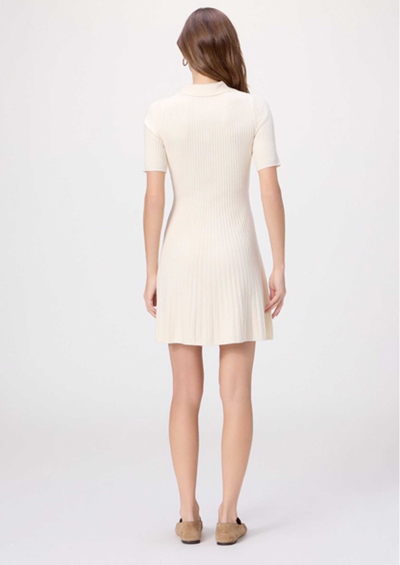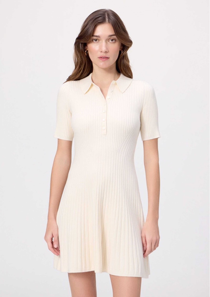 The Olie Dress in ecru by Paige offers a fresh, modern take on timeless tennis style. Crafted from compact yarn, this short-sleeve polo silhouette features a ribbed knit bodice that gradually flares at the hem for soft movement, while shoulder seams and a button-front placket bring a refined, sporty finish.
