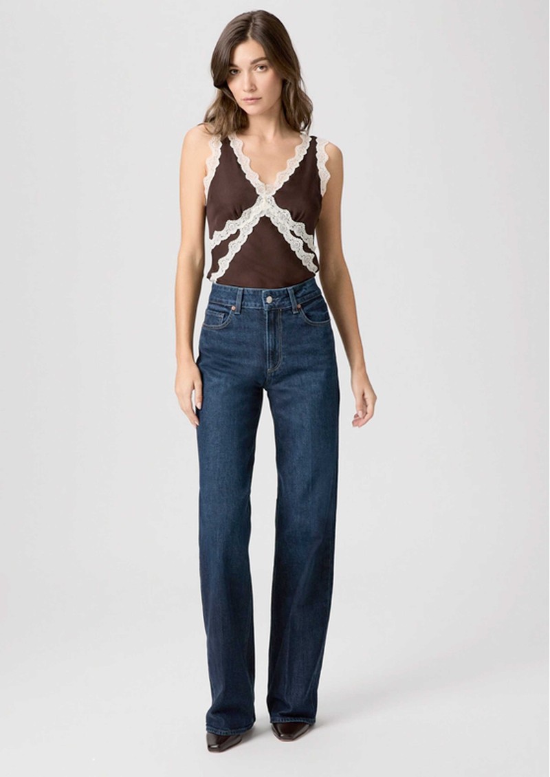The Paige Terezia Lace Edge Top in Chocolate/Ivory is a romantic, feminine staple crafted from 100% silk georgette, featuring a delicate bias cut that skims the body for a flattering, fluid silhouette. Its chocolate brown base is beautifully contrasted with intricate ivory lace trim along the neckline and hem, while subtle darting and gentle gathers at the shoulders add dimension and movement, making it a versatile piece that elevates any look.