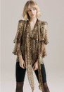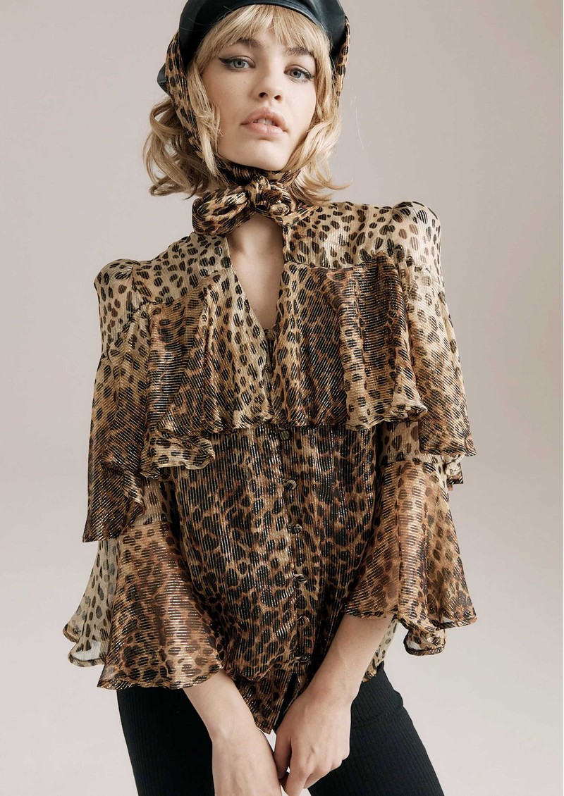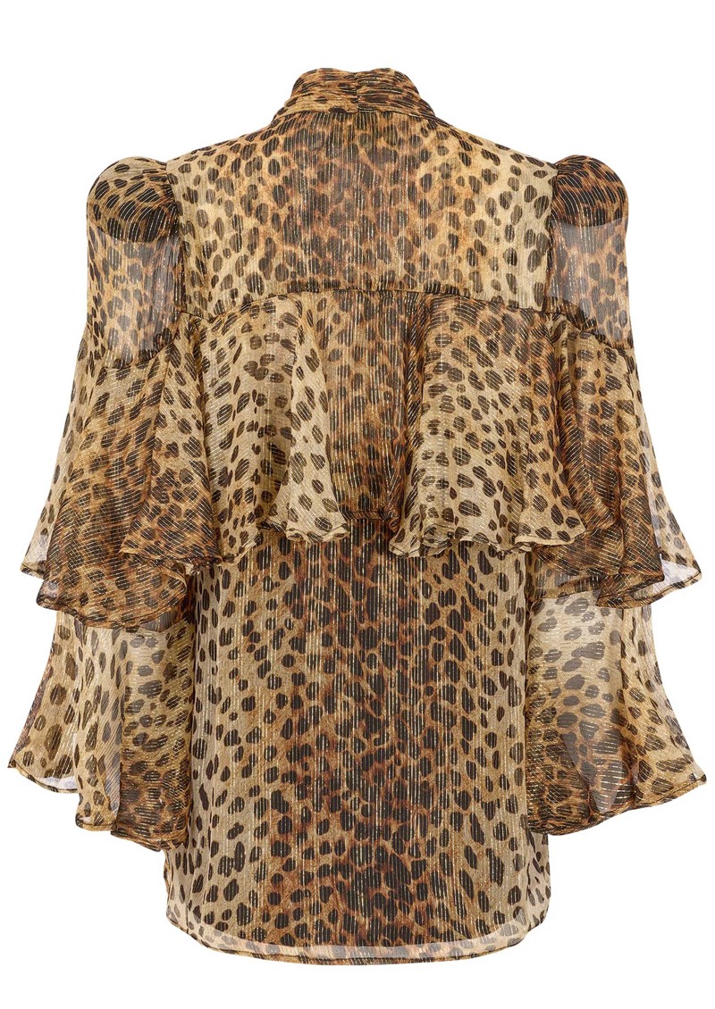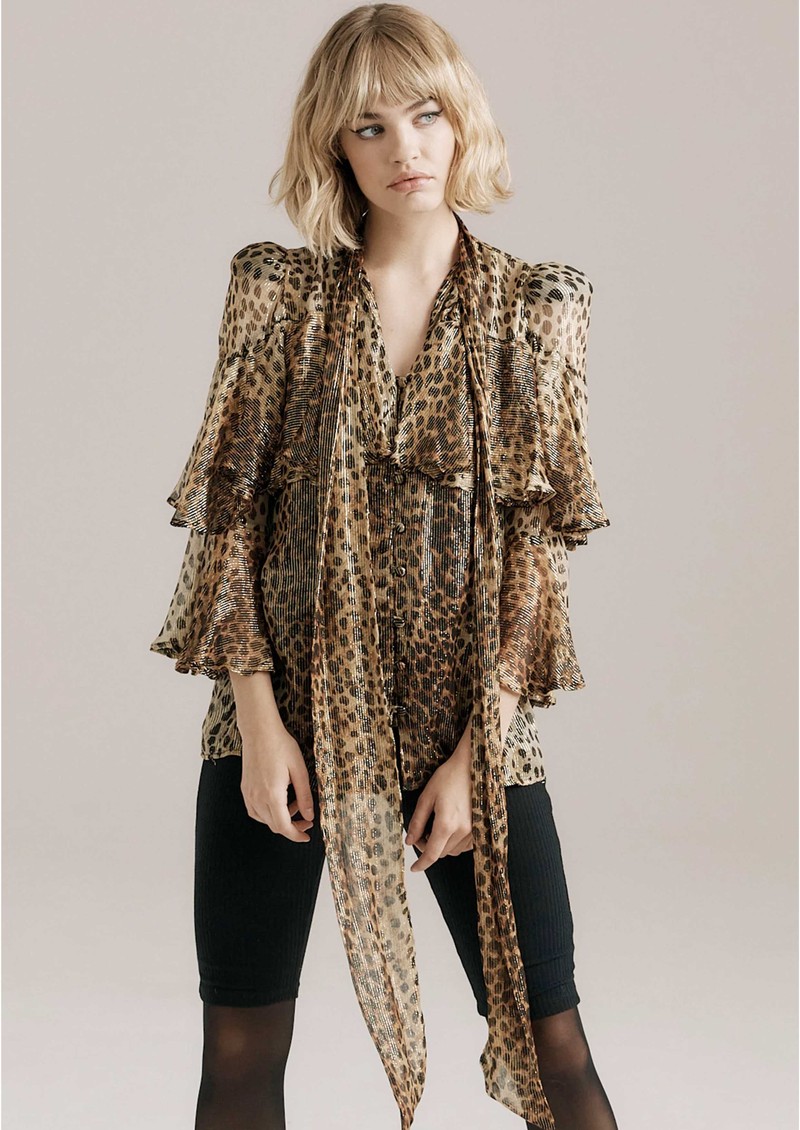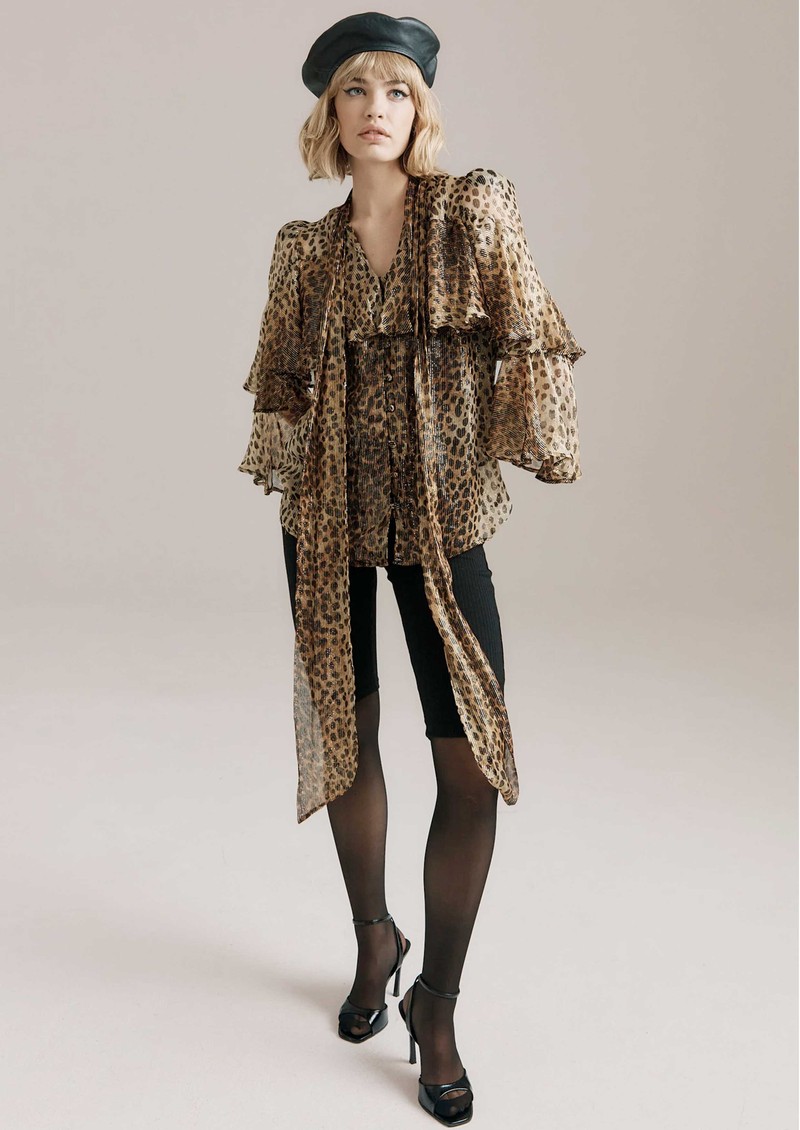 The Queens of Archive Bea channels the glamour of Studio 54 with unapologetic feminine confidence - a sheer cheetah-print lurex chiffon blouse that shimmers with every move. With its flowing cape sleeves, covered button-through front, and dramatic neck tie, she’s bold, wild, and utterly unforgettable.
