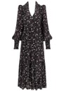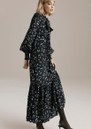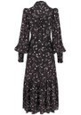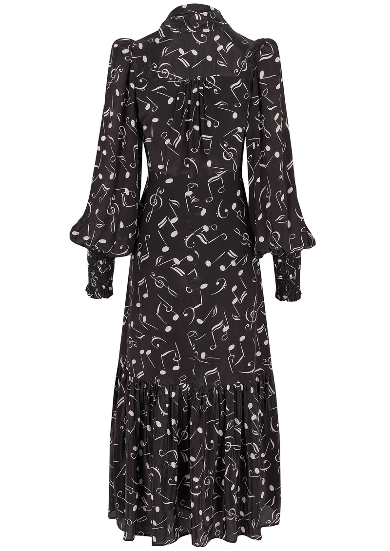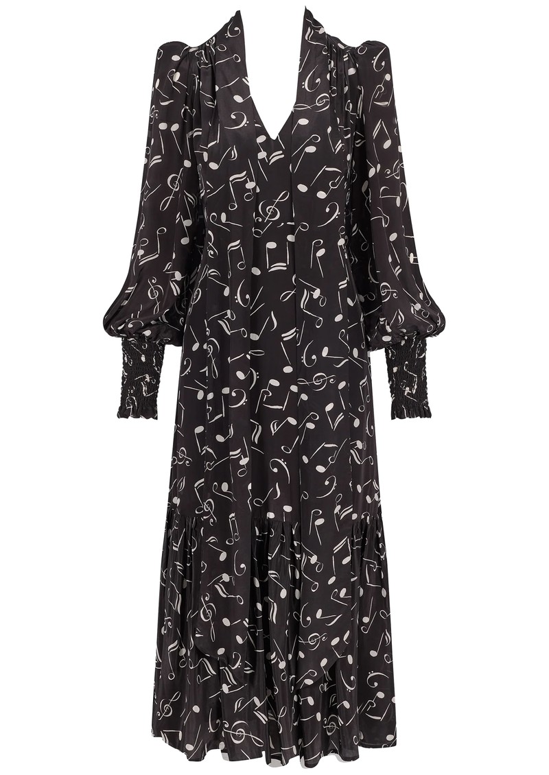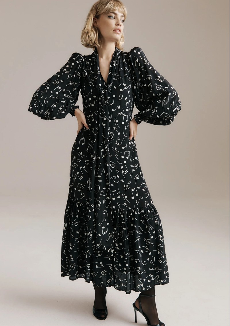 The Queens of Archive Hiroko is a flowing black crepe maxi dress adorned with a hand-painted clef motif, featuring structured shoulders, billowing long sleeves with shirred cuffs, a scarf tie neck, and a deep tiered hem for a 70s-inspired, elegant silhouette. Steeped in romance yet effortlessly wearable, it moves gracefully from day to night, leaving a lasting impression.