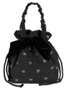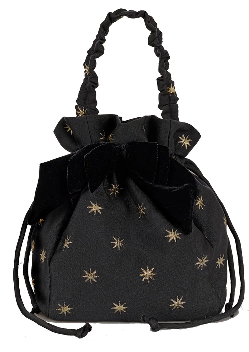 Introducing the Queens of Archive Molly -Starstruck Velvet Pouch Bag is a black star-jacquard bag with a plush velvet bow, a drawstring ruffle closure, and dual handles for wrist or shoulder wear. Surprisingly spacious yet neatly structured, it channels 60s and 70s evening glamour ideal for a sparkling, celestial statement.
