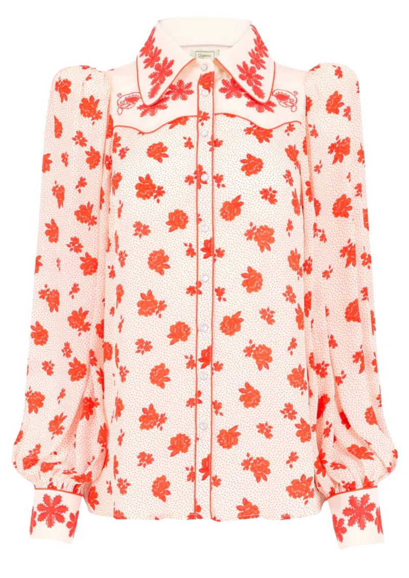 Say hello to the fabulous Queens of Archive Vivienne Top. In a crisp white hue finished with red roses, the western blouse is re-imagined for summer. Tonal red piping and voluminous sleeves add some cool girl flair Cut from fluid viscose, this top drapes effortlessly. Key features of this Queens of Archive top include: