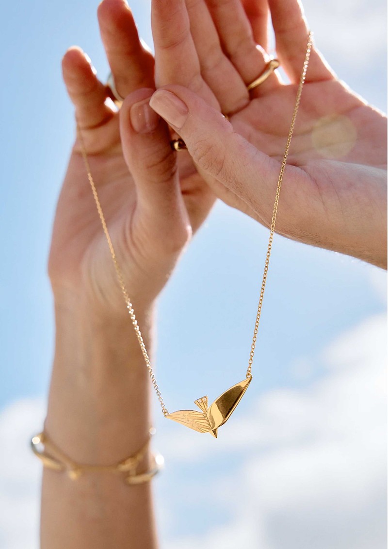 Capture a sense of freedom and elegance with the Rachel Jackson Celestial Bird Necklace. A bird in mid-flight features Art Deco-inspired wings adorned with star detailing, while four sparkling white sapphires trace its tail for a subtle shimmer. Hand-crafted from 18ct gold-plated sterling silver, the bird hangs from an adjustable chain and can be worn solo or layered.