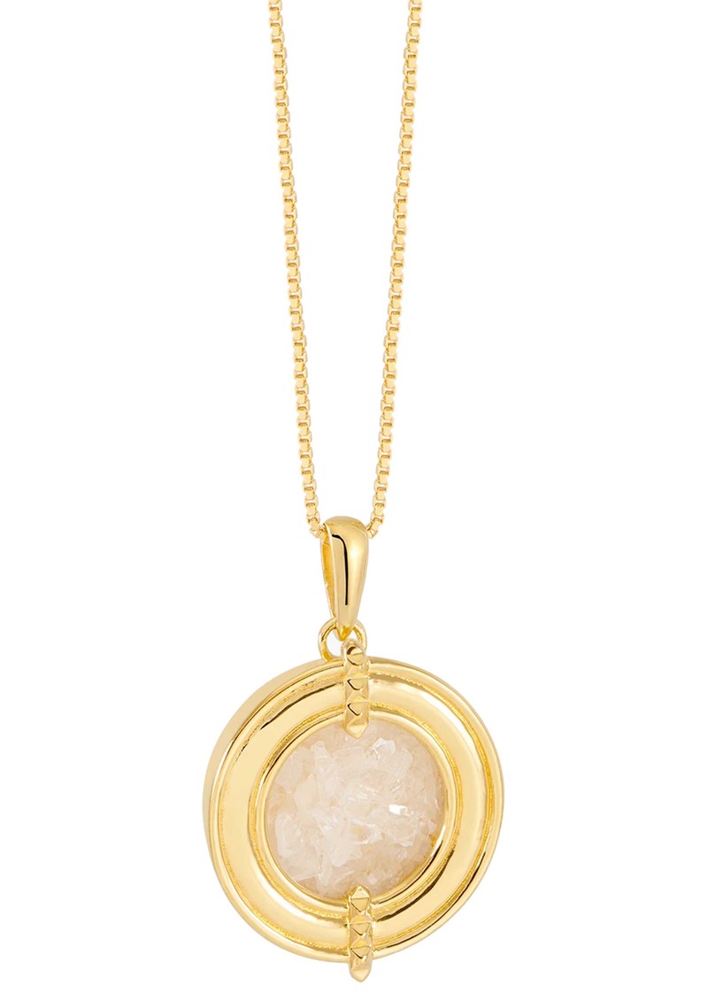 The Rachel Jackson Evolve Amulet Necklace in gold from the She collection offers a sculptural, contemporary twist on a timeless staple. Hand-crafted from 18ct gold-plated recycled silver and set with Rock Crystals; it features Art Deco-inspired detailing and an adjustable diamond-cut box chain for versatile, meaningful wear.