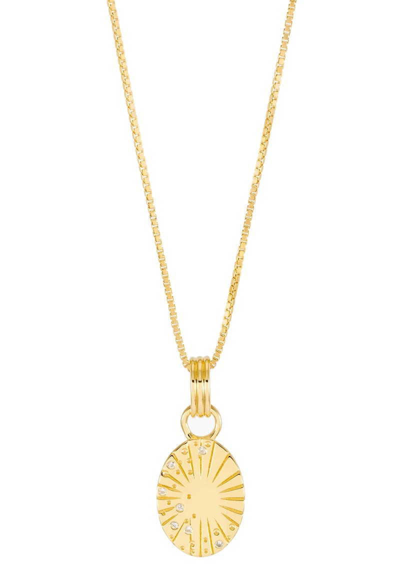 Carry a little sunshine with you with the Rachel Jackson Mini You are my Sun Pendant Necklace. Featuring signature Art Deco sun ray detailing and scattered white sapphires, this pendant sits beautifully on an adjustable-length chain and has a smooth reverse, ideal for personal engraving.