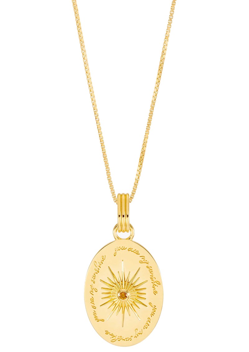 Add a touch of warmth and meaning to any outfit with the Rachel Jackson You Are My Sunshine Pendant Necklace, featuring a citrine gemstone and hand-engraved message. Adjustable and versatile, wear it alone for a subtle statement or layer with the Rachel Jackson pieces.