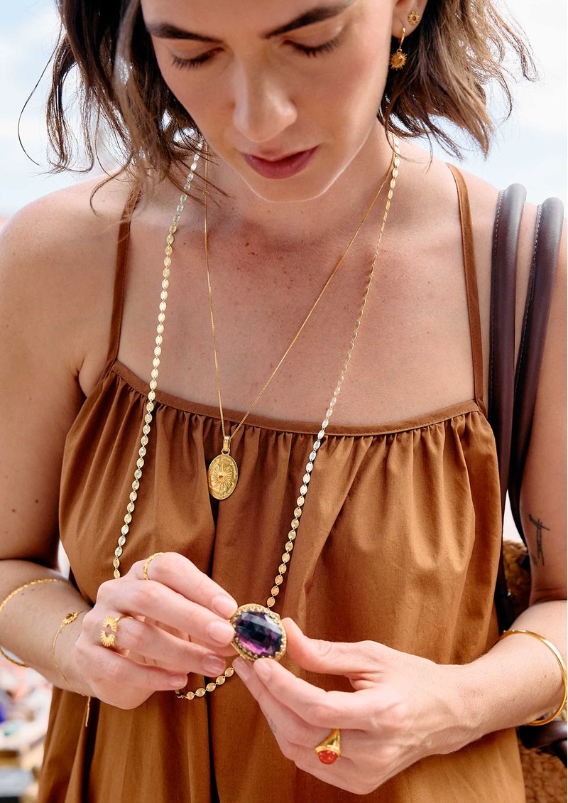 Layer your Rachel Jackson Necklace over a Hayley Menzies T-shirt, pair with Frame jeans, and finish with Rachel Jackson earrings for a chic, effortlessly styled outfit.
