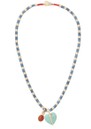 The Roxanne Assoulin Bar Necklace in Denim/Gold features polished gold-tone and semi-precious heishi beads, accented with a removable turquoise heart charm and a semi-precious carnelian cabochon charm. A button closure with macramé detail and 17” length make it a versatile, stylish statement piece.