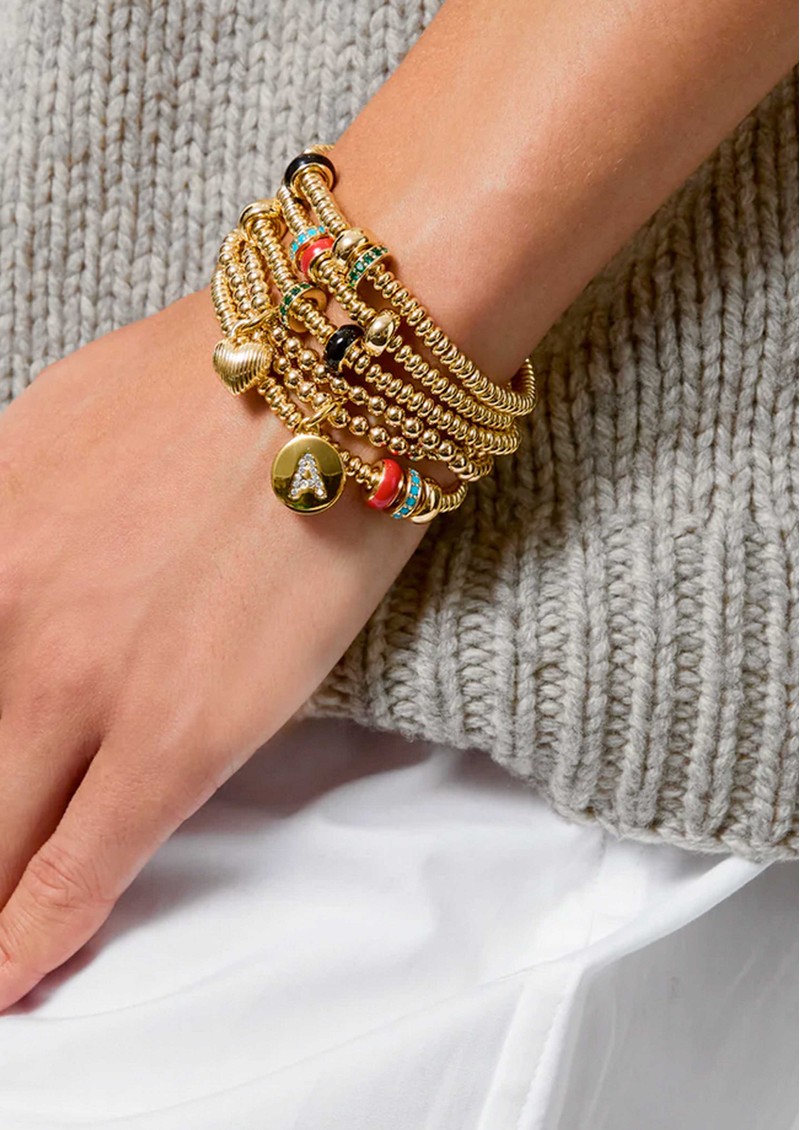 This Roxanne Assoulin bracelet is made of polished gold-tone metal with enamel and crystal slider charms on a comfortable stretch cord.