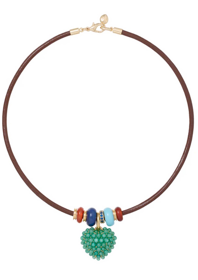 The Roxanne Assoulin Leather Cord Slider Necklace in Green features a cognac leather cord with colourful sliders in brown glass, turquoise, lapis, carnelian tones, and sapphire pave, accented with polished gold-tone details. A lobster clasp closure and 15” length make it easy to layer or wear solo for a stylish, versatile look.