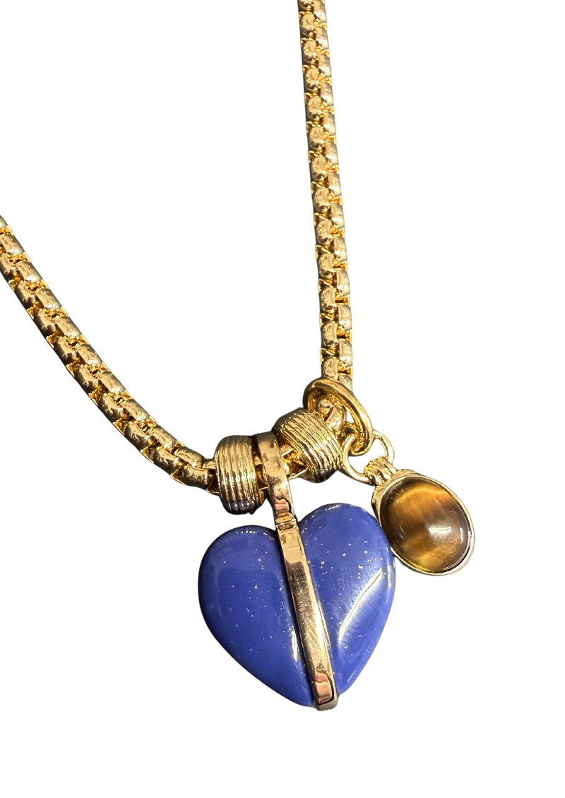 The Roxanne Assoulin Mini Semi Heart Charm Necklace in Gold features a delicate polished gold-tone chain with a tigers eye charm and lapis heart charm. Its approx 26” length with a mix of 2 different chain styles for a fun combination.
