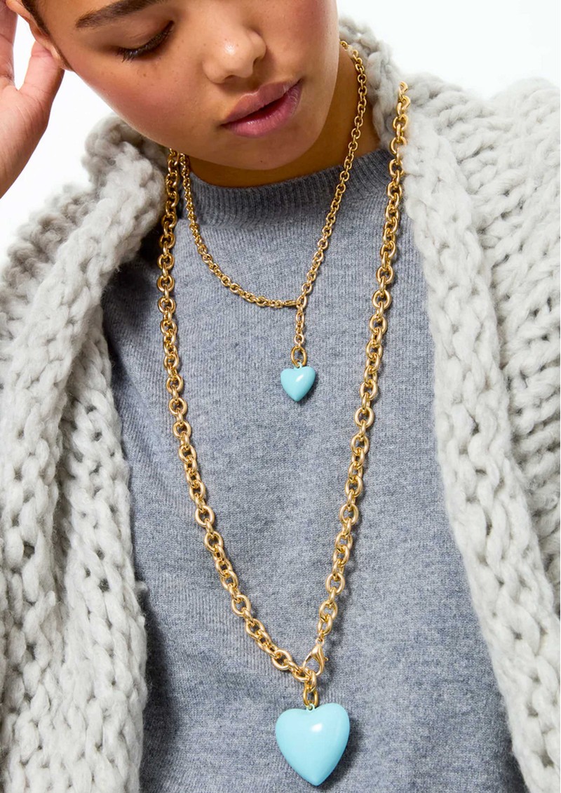 Bring a whimsical touch to your wardrobe with the Roxanne Assoulin Puffy Heart Necklace in Cloud, featuring a sleek gold chain and a removable oversized heart charm.