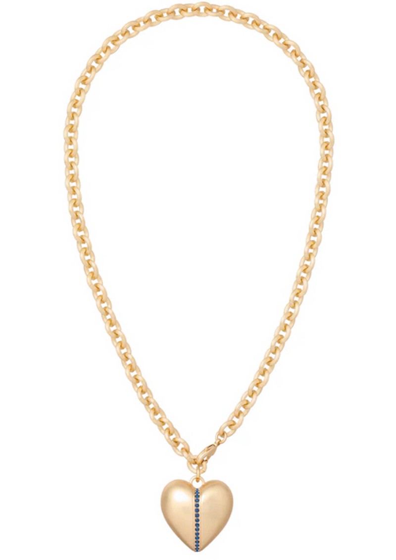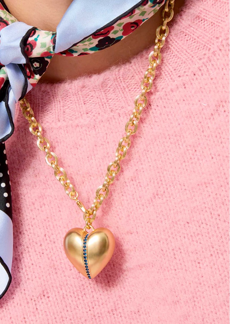 The Roxanne Assoulin Sapphire Stripe Puffy Heart Necklace in Gold features a satin gold-tone puffy heart pendant adorned with sapphire pave on a Florentine link chain. With a 19” chain and lobster closure, it’s a sparkling, elegant statement piece.