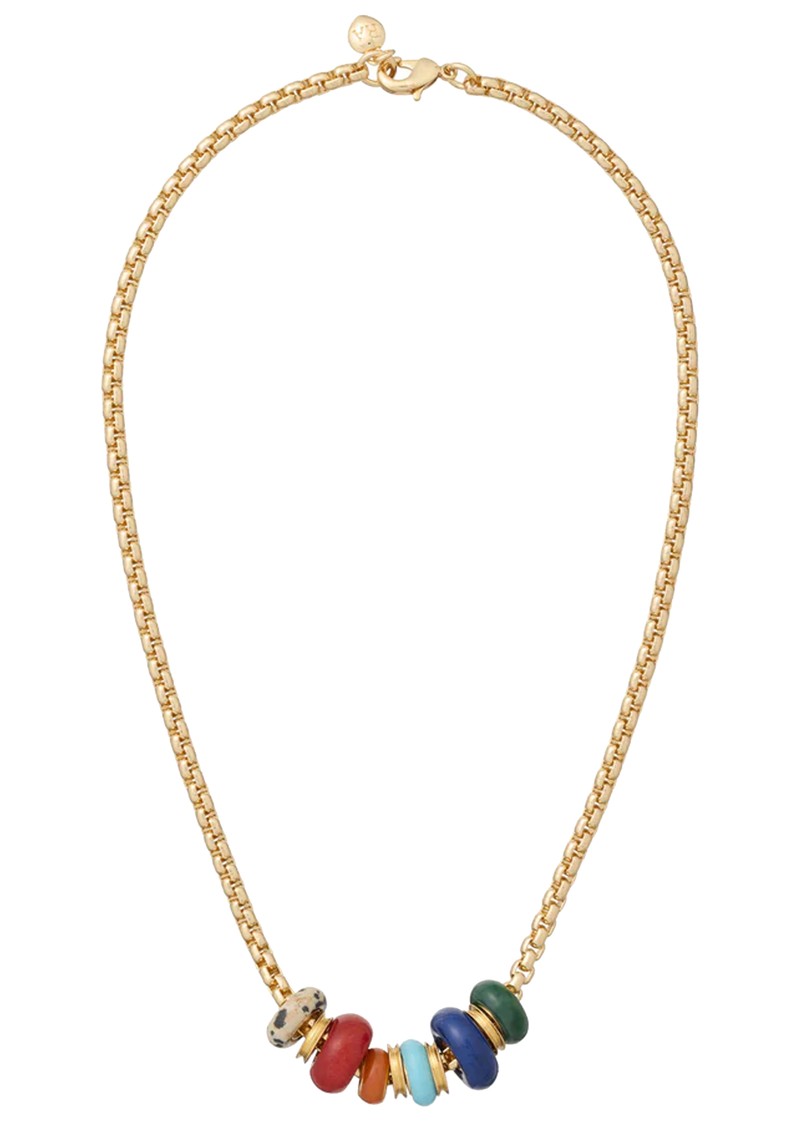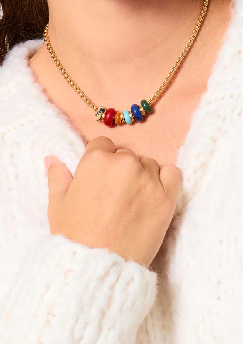 Invite a little extra detail into your style with the Roxanne Assoulin The Stone Slider Necklace, featuring a gold-tone box chain adorned with slider beads in a mixture of stones. Perfect for layering or wearing solo as a playful, meaningful accessory.
