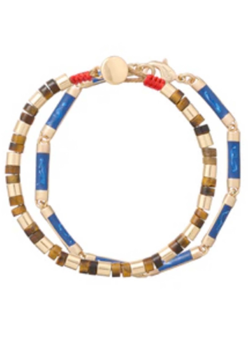 These Roxanne Assoulin bracelets are crafted from polished gold-tone beads, semi-precious tiger’s eye stones and hand-enamelled details.