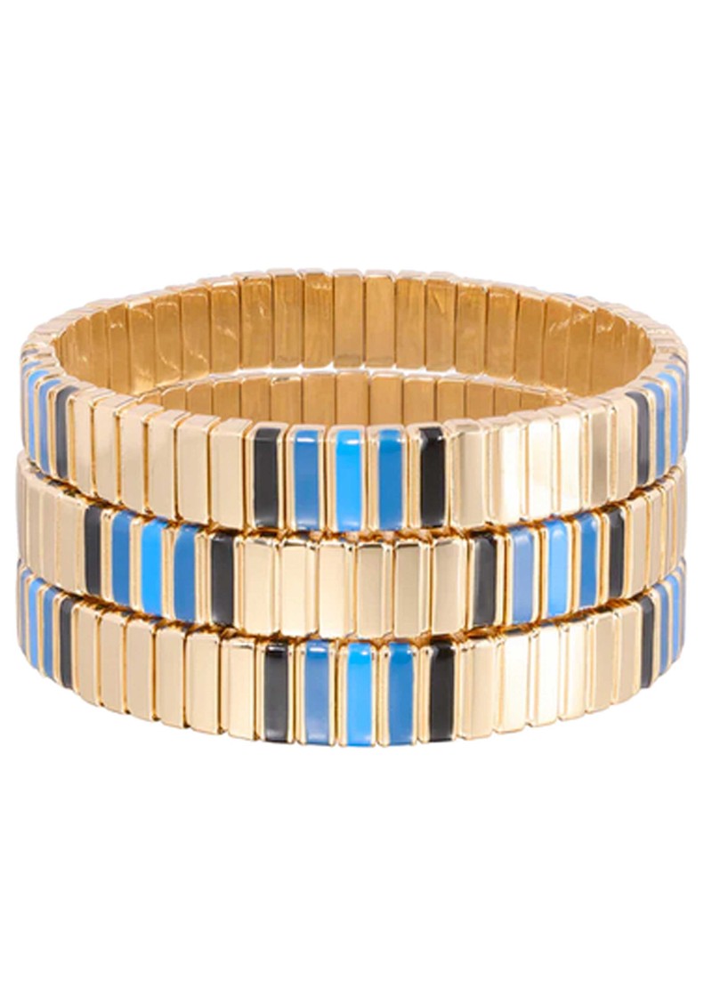 The Roxanne Assoulin Very Well Done Triple Stack Bracelets bring instant shine and effortless layering to your wrist with three perfectly stacked strands in polished gold tone. Finished with playful hand-enamelled details and an easy stretch fit, they’re your go-to for everyday glamour.