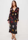 The Rails Alixa dress exudes effortless romance in lightweight chiffon, featuring a lined body, deep V-neckline with cascading ruffles, and a soft floral print. It is detailed with front button closures and long sleeves finished with smocked bell cuffs for a feminine, flowing silhouette.