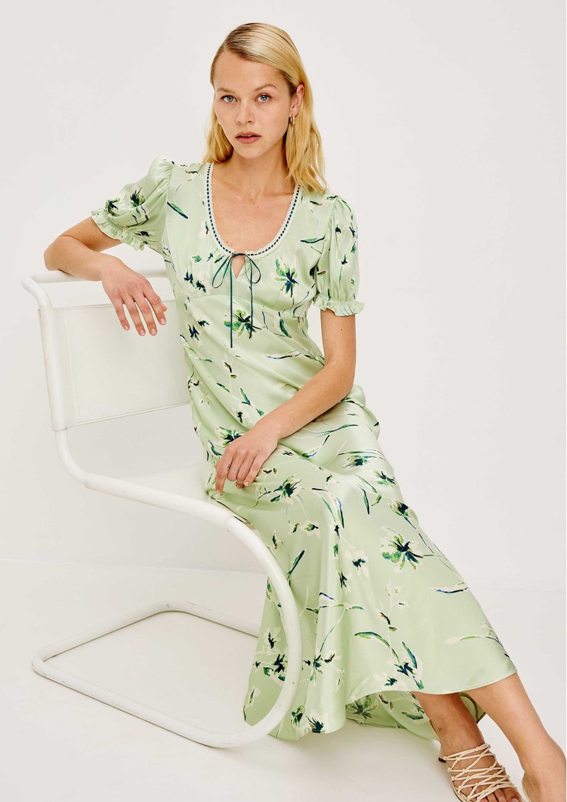 The Rails Allison Dress in Mint Linnea is a dreamy milkmaid-inspired maxi, crafted from lustrous bias-cut satin crepe for a soft, flowing silhouette. It features short puff sleeves, a scoop neckline detailed with delicate lace and ribbon trim, centre-front ties, and a discreet side-seam zipper for an effortless fit. Made from a comfortable blend of viscose and rayon, this elegant dress is perfect for both daytime events and evening occasions.