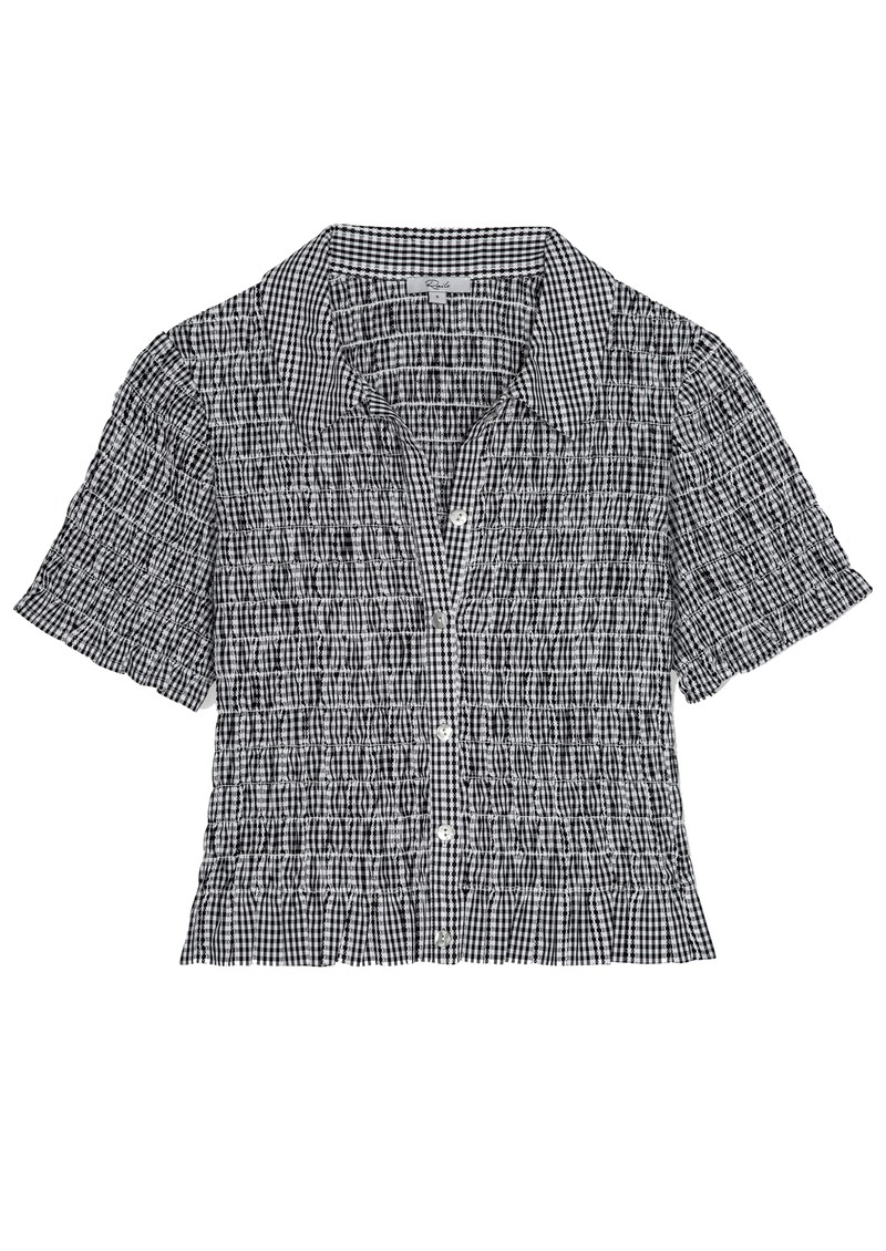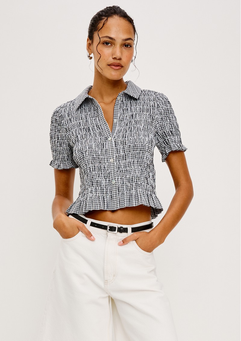 The Rails Alton Gingham Short Sleeve blouse features smocking all over, short sleeves, and a flattering peplum style hem for a feminine touch. Crafted from 100% cotton poplin, this blouse combines comfort and structure, making it perfect for effortless everyday wear. Key features of this Rails top are:
